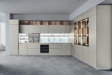 Kuhinja TWIST s aparatima*: napa + pećnica + ploča (staklokeramika) + sudoper, širina 240cm, cement siva mat, bijela visoki sjaj i taupe visoki sjaj.