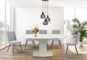 Blagovaonski set: razvlačni stol BEVERLY, 120/160x80cm, boja bijela + 4x stolica MATIS, siva tkanina / metalne crne