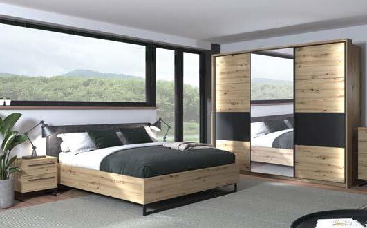 Soba MARBELLA: krevet JUPITER, 160x200cm, podizna podnica, spremnik, bež ili sivi tekstil + 2x noćni ormarić, 51x44x40cm + ormar MARBELLA, 217x62,5x210cm, 6 polica, artisan hrast/siva/ogledalo. Paspartu i led rasvjeta na ormaru uz nadoplatu.