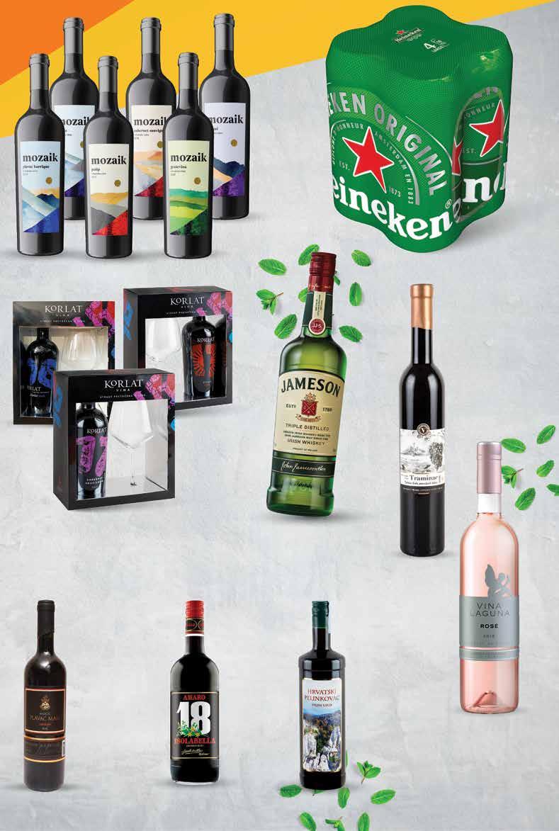 crno vrhunsko vino temperatura posluživanja: 18°C VINA MILIČIĆ Plavac mali selekcija crno vrhunsko vino 0,75 l AMARO 18 Liker Isolabella 1 l MOZAIK Crno ili bijelo vrhunsko vino razne vrste 0,75 l VINO ILOK Traminac izborna berba prosušenih bobica, vrhunsko bijelo vino 0,5 l HEINEKEN Svijetlo pivo udio alkohola 5% 4x 0,5 l DEGENIJA Pelinkovac udio alkohola 30% 1 l Prilika