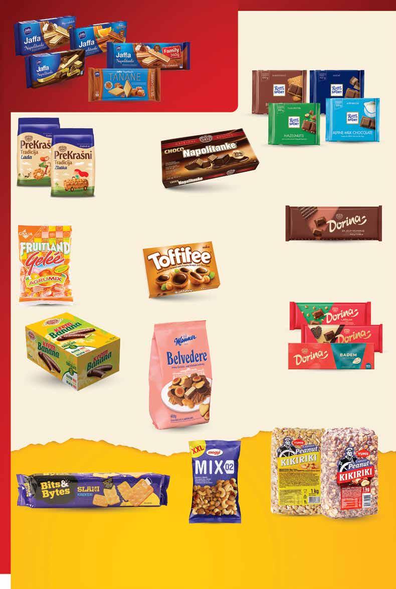 DORINA Čokolada odabrane vrste RITTER Čokolada punjena odabrane vrste KRAŠ Napolitanke čokoladne TOFFIFEE Bombonijera s lješnjacima i karamelom 125 g Krem bananica XXL 544 g KRAŠ Čajno pecivo Lada ili Zlatka 200 g Kikiriki pečeni ili prženi u opni ili slani 1 kg