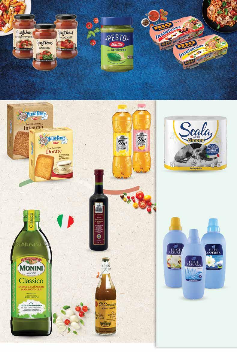 MONINI Maslinovo ulje ekstra djevičansko 1 l FARCHIONI IL CASOLARE Ulje maslinovo ekstra djevičansko 1 l RIO MARE Tuna salata Insalatissime odabrane vrste 2x 160 g BARILLA Pesto Genovese 190 g IL DUOMO Začinski ocat 500 ml GUSTIBUS Umaci razne vrste 400 g MULINO BIANCO Dvopek obični ili integralni 315 g SAN BENEDETTO Ledeni čaj limun ili breskva 1,5 l SCALA Ručnici Limone dvoslojni 2 role FELCE AZZURRA Omekšivač rublja razne vrste 2 l Prilika vikenda!Super prilika! Prilika tjedna! 1 59 € 11.98 kn 1 l = 0,80 € / 5,99 kn -54% 3.49 € / 26.30 kn Prilika vikenda!Super prilika! Prilika tjedna! 1 85 € 13.94 kn 1 rola = 0,93 € / 6,97 kn -22% 2.39 € / 18.01 kn Prilika vikenda!Super prilika! Prilika tjedna! 3 98 € 29.99 kn 1 kg = 12,44 € / 93,72 kn -49% 7.83 € / 59.00 kn Prilika vikenda!Super prilika! Prilika tjedna! 1 15 € 8.66 kn 1 l = 0,77 € / 5,77 kn -21% 1.46 € / 11.00 kn Prilika vikenda!Super prilika! Prilika tjedna! 1 69 € 12.73 kn 1 l = 3,38 € / 25,46 kn -42% 2.92 € / 22.00 kn Prilika vikenda!Super prilika! Prilika tjedna! 1 49 € 11.23 kn 1 kg = 3,73 € / 28,08 kn -29% 2.12 € / 15.97 kn Prilika vikenda!Super prilika! Prilika tjedna! 1 59 € 11.98 kn 1 kg = 5,05 € / 38,03 kn -33% 2.39 € / 18.01 kn Prilika vikenda!Super prilika! Prilika tjedna! 2 99 € 22.53 kn 1 kg = 15,74 € / 118,58 kn -29% 4.25 € / 32.02 kn Prilika vikenda!Super prilika! Prilika tjedna! 5 79 € 43.62 kn -21% 7.39 € / 55.68 kn Prilika vikenda!Super prilika! Prilika tjedna! 7 99 € 60.20 kn -19% 9.95 € / 74.97 kn 2 x 160 g 2 l Fotografije