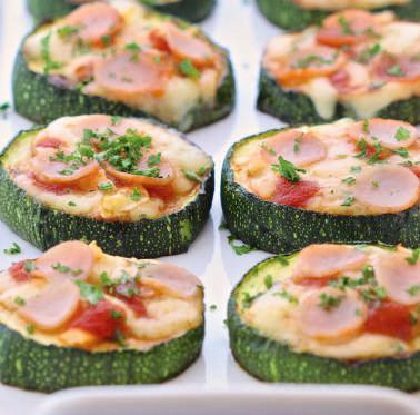 Tikvicu dobro operite i posušite. Narežite tikvicu na kolute debljine 1 cm te ih prepecite s obje strane na roštilju ili gril tavi. Tikvice zatim odložite sa strane i na njih posložite željene sastojke. Kombinirajte sir za pizzu i dimljeni sir s paprikom za bolji okus, pasiranu rajčicu s malo soli, peršin ili svježi origano i šunku kao mesni dio ovih mini pizza. Šunku možete izdubiti pomoću sprave za uklanjanje sredina jabuka ili je narezati na uske trakice i tako posložiti preko sira i tikvica. Ako tikvice pripremate na roštilju, vratite ih nazad na rešetku, a ako ih pripremate u pećnici, stavite ih na maksimalnu temperaturu na nekoliko minuta. Dovoljno da se sir otopi.