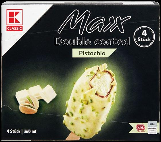 MAX DOUBLE COATED Što je bolje od jednog sloja čokolade? Dva! Između hrskave bijele čokolade i kremastog sladoleda od pistacija krije se neodoljivo svilenkasti čokoladni preljev.
