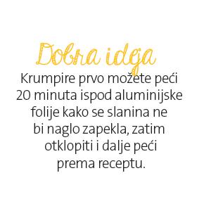 Krumpire operite i dobro četkicom izribajte, zatim obrišite kuhinjskim papirom. Svaki krumpir zarežite na tanje ploške, pazeći da ga ne prerežete do kraja. Posolite ih i između svake ploškice stavite komadić slanine i sira.