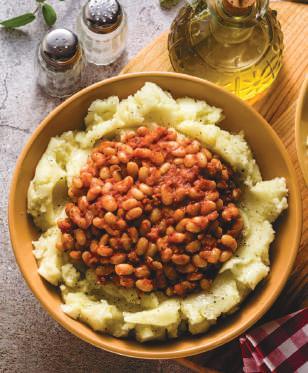 Krumpir stavite kuhati u posoljenu vodu. Kad je gotov ocijedite ga od viška vode i u njega dodajte mlijeko, maslac i kiselo vrhnje. Sve dobro izmiješajte i po potrebi još posolite. U većoj tavici na biljnom ulju prepržite luk narezan na kockice. Dodajte češnjak i papriku narezanu na kockice. Pirjajte 5 minuta pa dodajte pire od rajčice i crvenu slatku papriku. Pirjajte još 3 minute pa dodajte grah i podlijte s 500 ml vode. Kuhajte dok voda ne ispari i grah se ne ugusti. Posolite i popaprite po želji pa poslužite. Servirajte pite krumpir na dno i na njega gusti grah.