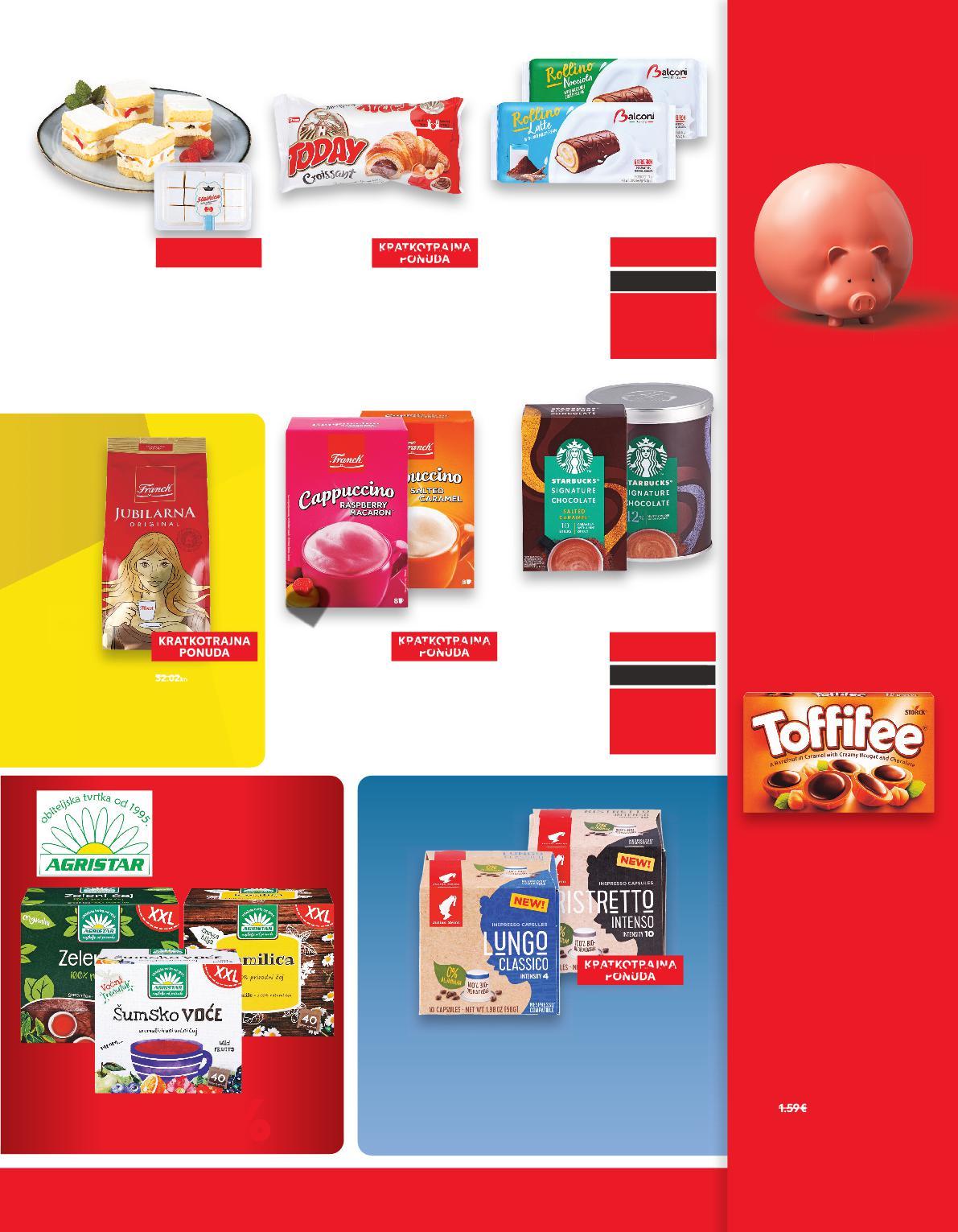 XXL ČAJEVI -50 3.01kn FRANCK Mljevena kava Jubilarna 400 g FRANCK Cappuccino razne vrste 112- 160 g STARBUCKS Čokoladni napitak Signature chocolate ili Salted caramel 330g ili 220 g (=1 kg 10,60€) (=1 kg 14,46 ili 21,69€) okoladni apitak atur oladni samo SUPER CIJENA SUPERCIJENA UPER-0% 0% 4.24€ (=1 kg od 14,07 do 20,09 €) SUPER CIJENA-15% 2.25€ 2.65€ KRATKOTRAJNA samo SUPER CIJENA SUPERCIJENA UPER-0% 0% 4.77€ 31.95kn 22.98kn 19.97kn 37.60kn 16.95kn 35.94kn 2.64kn Ledeni vjetar svježi kolači 420 g -38% 3.05€ 4.99€ (=1 kg 6,37€) TODAY Croissant od lješnjaka i čokolade 55 g SUPER CIJENA-12% 0.35€ 0.40€ 15.75kn 10.93kn -30% 1.45€ 2.09€ KAUFLAND NISKA CIJENA (=1 kg A 445,36/ KC 410,40 kn) JULIUS MEINL Biorazgradive kapsule razne vrste 56 g (=1 kg A 59,11/ KC 54,47 €) SUPER CIJENA -24% 3.31€ 4.39€ 3.05€ -30% 30% 22.98 kn 33.08kn 24.94kn 15.000 PROIZVODA NA NIŽE! POVOLJNI U EURU! u kuni, povoljni ZAOKRUŽILI SMO CIJENE VIŠE OD 15.000 PROIZVODA NA NIŽE! BIRAJ POVOLJNO KAO DO SAD 21.99 kn 2.92€ 21.77 kn 2.89€ STARA CIJENA PRIJE 1.1.2023. SADAŠNJA CIJENA TOFFIFEE Bombonijera s lješnjakom i karamelom 125 g (=1 kg 79,87 kn) (=1 kg od 106,01 do 151,37 kn) (=1 kg 47,99 kn) (=1 kg 108,95 ili 163,42 kn) (= 1 kg 7,27€) (= 1 kg 54,78 kn) (=1 kg 6,54€) BALCONI Biskvitna tortica Rollino punjena kremom od kakaa, lješnjaka ili mlijeka 6 x 37 g (=1 kg 49,28 kn) PEKARSKI PROIZVODI KAVA, ČAJ & INSTANT NAPITCI S23-HR-KW02-LFT-NMP_2_D-1030-11 23