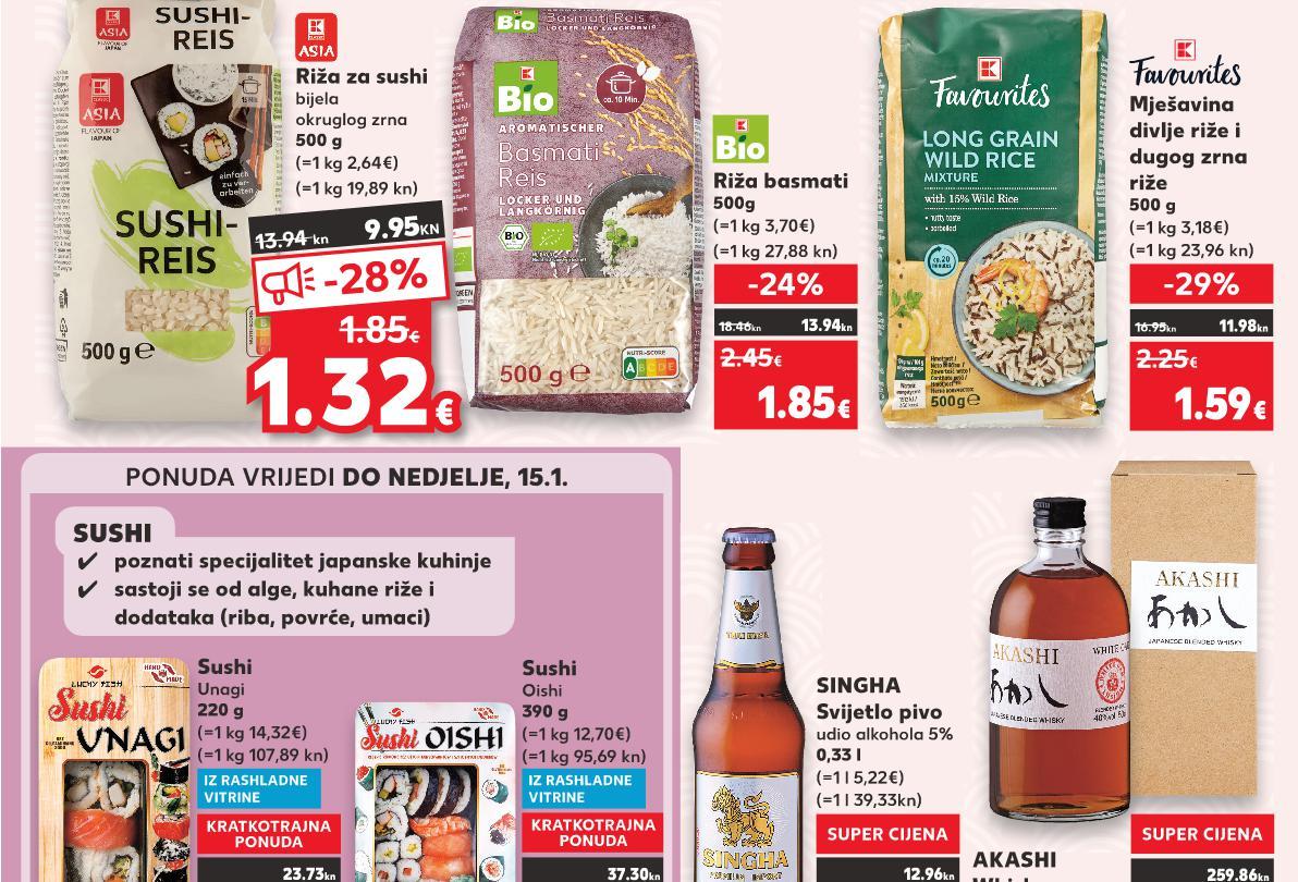 ✓poznati specijalitet japanske kuhinje ✓sastoji se od alge, kuhane riže i dodataka (riba, povrće, umaci) SUSHI dužine cca. 24 cm 7.29€ 5.49€ -24% dužine cca. 31 cm 10.59€ 6.99€ -33% 54.93kn 41.36kn 79.79kn 52.67kn 41.36 kn VEĆ OD 5.49€ IZ RASHLADNE VITRINE IZ RASHLADNE VITRINE Riža za sushi bijela okruglog zrna 500 g Riža basmati 500g (=1 kg 3,70€) (=1 kg 2,64€) SUPER CIJENA-24% 1.85€ 2.45€ Sushi Oishi 390 g Mješavina divlje riže i dugog zrna riže 500 g (=1 kg 12,70€) (=1 kg 3,18€) SINGHA Svijetlo pivo udio alkohola 5% 0,33 l Sushi Unagi 220 g (=1 l 5,22€) KRATKOTRAJNA PONUDA samo OTRAJNA CIJENA AJNA SUPER A0% ONUDA UPERCIJENA TR 4.95€ samo SUPER CIJENA SUPERCIJENA UPER-19% 19% UPERCIJENA 1.72€ (=1 kg 14,32€) SUPER CIJENAASHLADNE KRTK ATK SHLADNE AT -29% 1.59€ 2.25€ KRATKOTRAJNA PONUDA samo SUPERCIJENA KRATK AJNA SUPER CIJENAONUDAUPERPONUD ONUD TKOTRAJNA 0% UPERCIJENA TKOTR C A 3.15€ Santoku nož Asia Line od nehrđajućeg čelika komad Mesarski nož Asia Line od nehrđajućeg čelika dužine cca. 30cm komad SUPER CIJENA-28% 7.99€ 11.25€ 13.94kn 37.30kn 18.46kn 11.98kn 16.95kn 60.20kn 84.76kn 12.96kn 23.73kn Kuhinjski nož Asia Line od nehrđajućeg čelika dužine cca. 32 cm komad 52.67kn 74.97kn SUPER CIJENA-29% 6.99€ 9.95€ AKASHI Whisky udio alkohola 40% 0,5 l (=1 l 68,98€) samo SUPER CIJENA SUPERCIJENA UPER-0% 0% 34.49€ 259.86kn 13.94 kn 9.95KN 1 2 -28% 1.85€ 15.000 PROIZVODA NA NIŽE! (=1 l 519,73 kn) (=1 kg 107,89 kn) (=1 kg 19,89 kn) (=1 kg 95,69 kn) (=1 kg 27,88 kn) (=1 kg 23,96 kn) KOD NAS POTRAŽI VIŠE OD 50 VRSTA RIŽE! (=1 l 39,33kn) PONUDA VRIJEDI DO NEDJELJE, 15.1. S17-HR-KW02-LFT-AKTF_3_D-1030-11 17