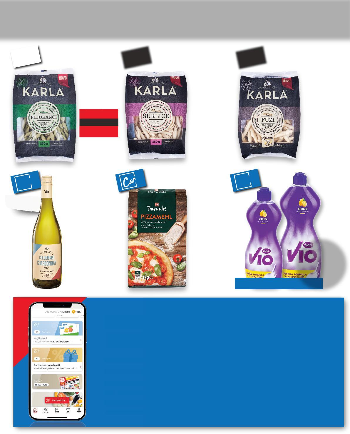 ODABERI KUPON KOJI 4. PRILIKOM NE AKTIVIRAJ, SKENIRAJ I U NOVITETU CIJENA 14.99kn Brašno za pizzu 1kg samo 1.99€ 14.99kn 1.59€ 11.98kn -20% 14.99kn 0.00kn (= kg R 7,96 € / 59,97 kn / KC 6,36 € / 47,92 kn) KARLA Tjestenina Tjestenina fuži sa tartufima 250 g samo 2.29€ samo 3.99€ 30.06kn KARLA Svježa tjestenina pljukanci sa špinatom 250 g KARLA Svježa tjestenina šurlice 250 g samo 1.99€ 14.99kn 17.25kn 1.59€ 3.18€ 11.98kn 23.96kn -20% -20% 1.82€ 13.71kn -20% IZ RASHLADNE VITRINE IZ RASHLADNE VITRINE IZ RASHLADNE VITRINE (=1 kg R 15,96€ / 120,25 kn / KC 12,72€ / 95,84 kn) (=1 kg R 9,16€ / 69,02 kn / KC 7,28€ / 54,85 kn) bijelo vino 0.00kn LE COMPLIMENT colombard chardonnay Francuska gastro preporuka: jela od mesa i ribe 0,75 l samo 3.95€ 29.76kn 1.08€ 8.14kn - 20% bijelo vino UŠTEDI -20% uz Kaufland Card -20% VIO DETERDŽENTI ZA SUĐE S45-HR-KW09-LFT-AKTF_6_D-1030-11 45