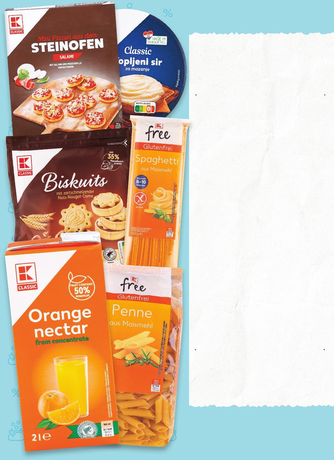 K-CLASSIC Topljeni sir classic 35% m m 110 g ušteda -1.79kn -0.24€ -2.40kn -0.32€ K-CLASSIC Keks sa lješnjak kremom 175 g ušteda -3.00kn -0.40€ K-FREE Tjestenina spagheti, penne ili fusilli 500 g ušteda -5.56kn -0.74€ K-CLASSIC Mini pizza salama 360 g ušteda -15.61kn -2.07€ ovaj tjedan uz Kaufland Card na ove odabrane proizvode uštedi čak do KOŠARICA UŠTEDE penne ili fusilli 500 g Mini 360 g -2.86kn -0.38€ K-CLASSIC Voćni nektar naranča 50% 2 l ušteda S60-HR-KW06-LFT-PR_RS-1030-11 60