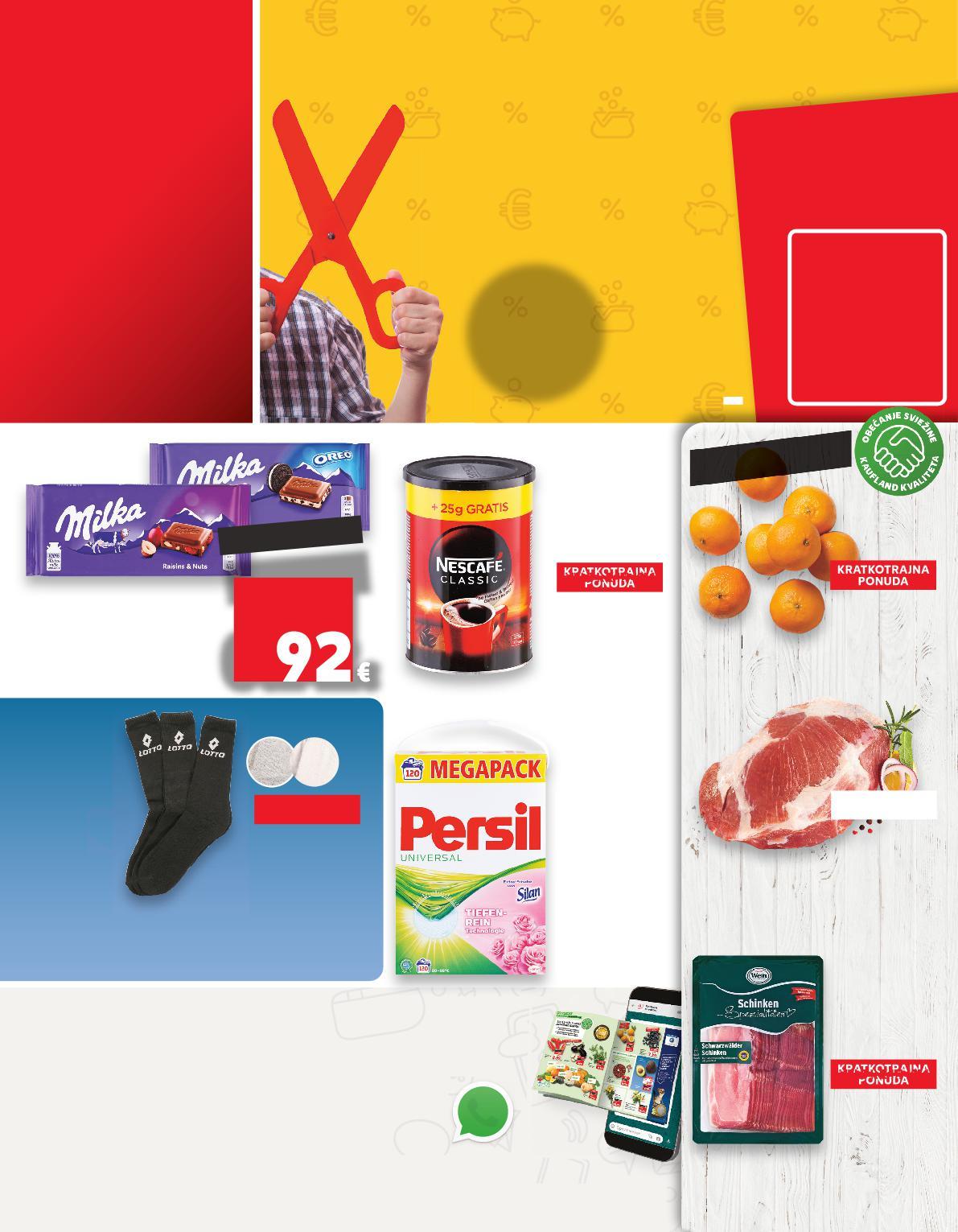 PRVI U HRVATSKOJ! PRIMAJ KATALOG NA WHATSAPP! POTPUNO BESPLATNO! Više na stranici 26-27 U katalogu su cijene u eurima izražene sukladno fiksnom tečaju konverzije 7.53450 kuna za jedan euro P I U ! u i Š S Z C E T E E *JER SU TAKO MALE VIŠE NA STR 28 45 MEGA REZ POVOLJNI U EURU! u kuni, povoljni ZAOKRUŽILI SMO CIJENE VIŠE OD 15.000 PROIZVODA NA NIŽE! KUPUJ POVOLJNO KAO DO SAD VIŠEOD 210 NEPREHRAMBENIH PROIZVODA Kaufland ti donosi 836 PROIZVODA PO SUPER CIJENAMA PERSIL Deterdžent za rublje silan svježina *za 120 pranja 7,8 kg (=1 kg 2,55€) KRATKOTRAJNA PONUDA samo SUPERCIJENA KRATK AJNA SUPER CIJENAONUDAUPERPONUD ONUD TKOTRAJNA 0% UPERCIJENA TKOTR 19.89€ 149.86kn Sportske čarape 65% pamuk, 34% poliester, 1% elastan vel. 39/42-43/46 pakiranje (=1 kg 19,21 kn) REDOVITA KONTROLASOČNOSTI 65% 34% 1% Svinjska lopatica bez kostiju 1 kg MILKA Čokolada odabrane vrste 80-100 g KRATKOTRAJNA PONUDA samo SUPERCIJENA KRATK AJNA SUPER CIJENAONUDAUPERPONUD ONUD TKOTRAJNA 1% UPERCIJENA TKOTR 3.31€ NESCAFE Instant kava classic 275 g (=1 kg 26,52€) SUPER CIJENA-28% 6.63€ 9.29€ Klementine 1 kg WEIN Švarcvaldska šunka narezak trajni proizvod 500 g (=1 kg 11,40€) samo SUPER CIJENA SUPERCIJENA UPER-0% 0% 0.99€ SUPER CIJENA-41% 5.70€ 9.69€ 24.94kn 49.95kn 70.-kn 42.95kn 73.01kn 7.46kn KRATKOTRAJNA PONUDA SUPERCIJENA KRATK AJNA SUPER CIJENAONUDAUPERPONUD ONUD TKOTRAJNA 0% UPERCIJENA TKOTR samo 3.95€ 29.76kn 2.38€ -39% 39 17.93 kn (= 1 kg od 9,20 do 11,50€) VIŠEOD 16 VRSTA ZA 120 PRANJA IZ RASHLADNE VITRINE S USLUŽNOG PULTA 9.72 kn 6.93KN 0. -28% 1.29€ 3 para (=1 kg 85,89 kn) (= 1 kg od 69,32 do 86,65 kn) (=1 kg 199,81 kn) OD SRIJEDE, 11.1. DO UTORKA, 17.1.2022. OD 11.1. DO UTORKA, 17.1.2023. S1-HR-KW02-LFT-TS-1030-11