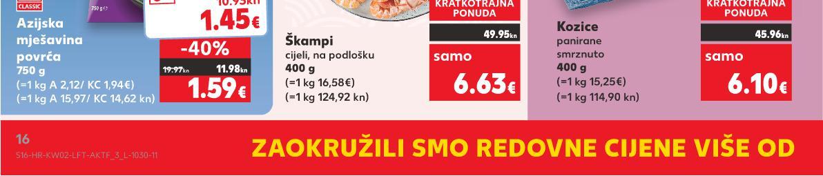 (=1 kg A 53,80/ KC 48,52 kn) GIANA Salata od tune razne vrste 185 g (=1 kg A 7,14/ KC 6,44€) samo SUPER CIJENA SUPERCIJENA UPER-0%UPER0% 1.32€ 9.95kn 1.19€ 8 97 kn KOLEDA Tjestenina s jajima razne vrste 400 g (=1 kg 3,63€) SUPER CIJENA-27% 1.45€ 1.99€ 10.93kn 14.99kn (=1 kg 27,35 kn) D O -35% KREM JUHE 15.000 PROIZVODA NA NIŽE! 7 POVOLJNI U EURU! u kuni, povoljni ZAOKRUŽILI SMO CIJENE VIŠE OD 15.000 PROIZVODA NA NIŽE! BIRAJ POVOLJNO KAO DO SAD 21.99 kn 2.92€ 21.77 kn 2.89€ STARA CIJENA PRIJE 1.1.2023. SADAŠNJA CIJENA L´ANGELICA Gel za tuširanje odabrane vrste 500 ml (=1 kg 3,24€) JAMI Pita sa sirom ili krumpirom 10 x 90 g ISKON Suncokretovo ulje rafinirano 1 L samo SUPER CIJENA SUPERCIJENA UPER-4% 4% 1.67€ 12.58kn 39.86kn 21.93KN kn 2.9 -44% 5.29€ KAUFLAND NISKA CIJENA (=1 kg 24,41 kn) MEGAMILK Maslac 82% m.m. 250 g (=1 kg 7,96€) KRATKOTRAJNA PONUDA samo SUPERCIJENA KRATK AJNA SUPER CIJENAONUDAUPERPONUD ONUD TKOTRAJNA 0% UPERCIJENA TKOTR 1.99€ 14.99kn IZ RASHLADNE VITRINE (=1 kg 59,97 kn) KAUFLAND NISKA CIJENA S5-HR-KW02-LFT-AKTF_1_D-1030-11 5