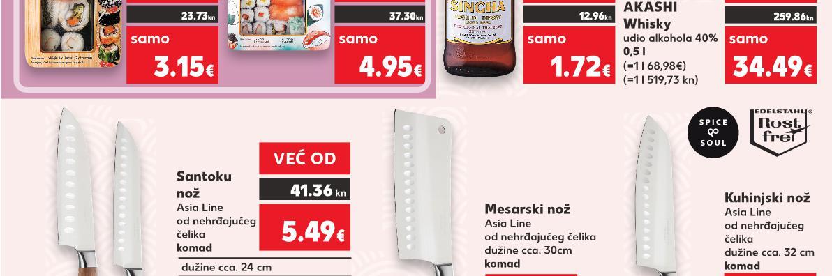 ✓poznati specijalitet japanske kuhinje ✓sastoji se od alge, kuhane riže i dodataka (riba, povrće, umaci) SUSHI dužine cca. 24 cm 7.29€ 5.49€ -24% dužine cca. 31 cm 10.59€ 6.99€ -33% 54.93kn 41.36kn 79.79kn 52.67kn 41.36 kn VEĆ OD 5.49€ IZ RASHLADNE VITRINE IZ RASHLADNE VITRINE Riža za sushi bijela okruglog zrna 500 g Riža basmati 500g (=1 kg 3,70€) (=1 kg 2,64€) SUPER CIJENA-24% 1.85€ 2.45€ Sushi Oishi 390 g Mješavina divlje riže i dugog zrna riže 500 g (=1 kg 12,70€) (=1 kg 3,18€) SINGHA Svijetlo pivo udio alkohola 5% 0,33 l Sushi Unagi 220 g (=1 l 5,22€) KRATKOTRAJNA PONUDA samo OTRAJNA CIJENA AJNA SUPER A0% ONUDA UPERCIJENA TR 4.95€ samo SUPER CIJENA SUPERCIJENA UPER-19% 19% UPERCIJENA 1.72€ (=1 kg 14,32€) SUPER CIJENAASHLADNE KRTK ATK SHLADNE AT -29% 1.59€ 2.25€ KRATKOTRAJNA PONUDA samo SUPERCIJENA KRATK AJNA SUPER CIJENAONUDAUPERPONUD ONUD TKOTRAJNA 0% UPERCIJENA TKOTR C A 3.15€ Santoku nož Asia Line od nehrđajućeg čelika komad Mesarski nož Asia Line od nehrđajućeg čelika dužine cca. 30cm komad SUPER CIJENA-28% 7.99€ 11.25€ 13.94kn 37.30kn 18.46kn 11.98kn 16.95kn 60.20kn 84.76kn 12.96kn 23.73kn Kuhinjski nož Asia Line od nehrđajućeg čelika dužine cca. 32 cm komad 52.67kn 74.97kn SUPER CIJENA-29% 6.99€ 9.95€ AKASHI Whisky udio alkohola 40% 0,5 l (=1 l 68,98€) samo SUPER CIJENA SUPERCIJENA UPER-0% 0% 34.49€ 259.86kn 13.94 kn 9.95KN 1 2 -28% 1.85€ 15.000 PROIZVODA NA NIŽE! (=1 l 519,73 kn) (=1 kg 107,89 kn) (=1 kg 19,89 kn) (=1 kg 95,69 kn) (=1 kg 27,88 kn) (=1 kg 23,96 kn) KOD NAS POTRAŽI VIŠE OD 50 VRSTA RIŽE! (=1 l 39,33kn) PONUDA VRIJEDI DO NEDJELJE, 15.1. S17-HR-KW02-LFT-AKTF_3_D-1030-11 17