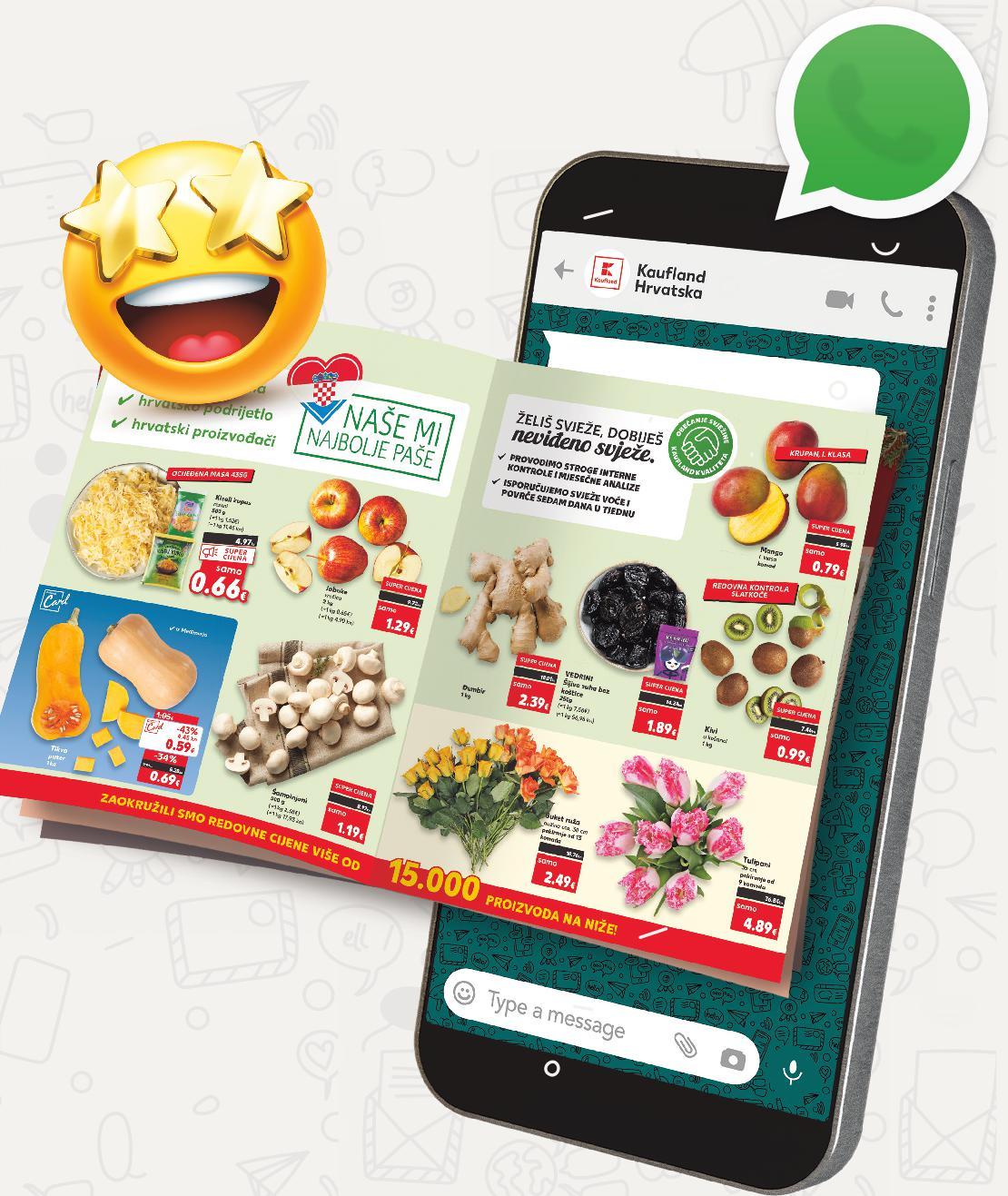 PRIMAJ KAUFLAND KATALOG NA WHATSAPP! POTPUNO BESPLATNO! PRVI U HRVATSKOJ! Skeniraj QR kod na stranici kataloga ili pošalji WhatsApp poruku sadržaja START na broj 099 3123 666. S2-HR-KW02-LFT-PR7-1030-11 2
