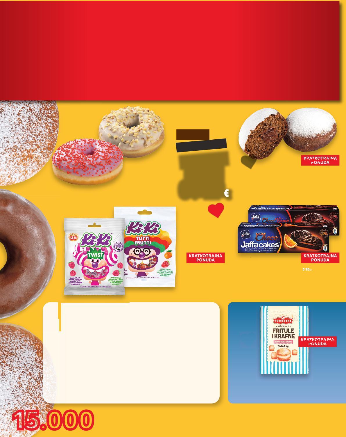 Donut krafna s punjenjem od jagode ili lješnjaka i badema 70 ii 72 g KI-KI Bomboni odabrane vrste 90-100 g JAFFA Biskvit sa želeom od naranče, višnje ili čokolade 150-155 g (=1 kg 7.-ili 6,81 €) (=1 kg od 8,60 do 9,56 €) (=1 kg od 4,84 do 5.-€) samo SUPER CIJENA SUPERCIJENA UPER-0% 0% 0.86€ samo SUPER CIJENA SUPERCIJENA UPER-5% 5% 0.75€ Krafna s nadjevom od lješnjaka 65 g (=1 kg 7.-€) SUPER CIJENA-36% 0.46€ 0.73€ 6.48kn 5.65kn 3.47kn 5.50kn (= 1 kg 0 99 €) MARKA Proizvod Opis Količina KRATKOTRAJNA PONUDA samo SUPER CIJENA-00% 0.99€ 0.99€ PODRAVKA Mješavina za fritule i krafne 1 kg SUPER CIJENA -23% 1.59€ 2.09€ 1.46€ -30% 30% 11.- kn 15.75kn 11.98kn IZ NAŠE PEKARE IZ NAŠE PEKARE 3.69kn s od 0.49 samo KRATKOTRAJNA PONUDA (=1 kg od 36,47 do 37,67 kn) (= 1 kg 0,00 kn) (=1 kg 52,74 ili 51,31 kn) (=1 kg 53,34 kn) (=1 kg od 64,80 do 72,03 kn) 0.00kn 0 00kn 0 00kn 0.00kn 0.00kn 0 00kn (= 1 kg 0.99 €) MARKA Proizvod Opis Količina samo -00% 0 9 0.99 samo -00% 0 9€ 0.99 (= 1 kg 0.99 €) MARKA Proizvod Opis Količina 0 9 (= 1 0,00 kn) (= 1 kg 0,00 kn) (= 1 kg 0,00 kn) PRIPREMI SE ZA VESELI VIKEND POD MASKAMA! S37-HR-KW07-LFT-AKTF_4_D-1030-11 37