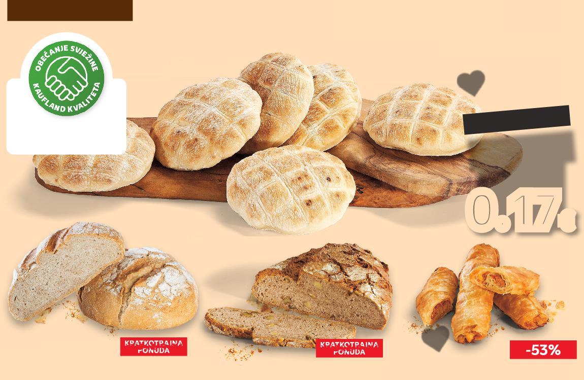 PONUDA SUPERCIJENA ONUDA KRATKOTRAJNA PONUDA SUPERCIJENA ONUDA T k Pekarski PEKARA OD SRIJEDE, 15.2. o p Topla OD 15.2. 1.96kn 1.28kn 0.17€ -34% 0.26€ PEČEMO VIŠE PUTA DNEVNO Mini somun 80 g Croissant punjen nougat kremom 100 g KLARA Kruh Fini domaći pakirani, narezani 700 g Toast s maslacem 500 g (=1 kg 2,13€) (=1 kg 5,90 €) (=1 kg 1,80 €) (=1 kg 2,64 €) KLAR SUPER CIJENA-43% 0.59€ 1.05€ SUPER CIJENA-25% 1.26€ 1.69€ SUPER CIJENA-28% 1.32€ 1.85€ 8.97kn 6.93kn 7.91kn 16.95kn 4.45kn 12.96kn 12.73kn 9.72kn 9.49kn 4.52kn 13.94kn 9.95kn (=1 kg 5,46 €) KRATKOTRAJNA SUPER CIJENAPONUDA 0.60€ 1.29€ Meksička rolica od pilećeg mesa, graha i kukuruza 110 g (=1 kg 1,84 €) SUPER CIJENA-22% 0.92€ 1.19€ Bakin kruh s Kalnika 500 g (=1 kg 4,30 €) SUPER CIJENA-23% 1.72€ 2.25€ Heljdin kruh s orasima 400 g (=1 kg 16,05 kn) (=1 kg 13,86 kn) (=1 kg 44,45 kn) (=1 kg 32,40 kn) (=1 kg 13,56 kn) (=1 kg 41,14 kn) (=1 kg 19,89 kn) ZAOKRUŽILI SMO REDOVNE CIJENE VIŠE OD -53% KAUFLAND NISKA CIJENA S16-HR-KW07-LFT-FRP_1_L-1030-11 16