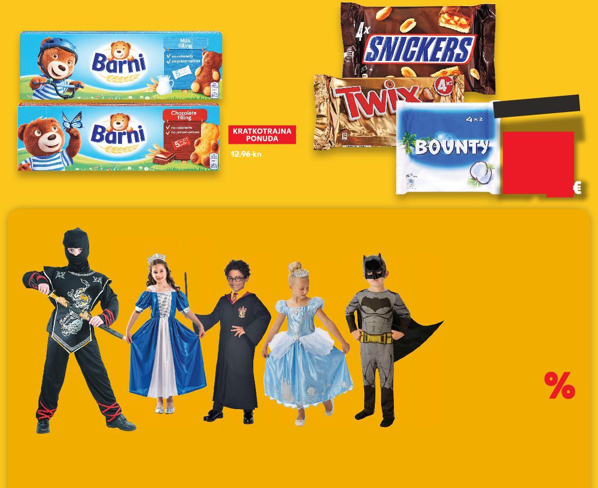 RAZVESELI MALE MAŠKARE OMILJENIM POKLONOM. BARNI Biskvit punjen mlijekom ili čokoladom 150 g (=1 kg 11,47€) samo SUPER CIJENA SUPERCIJENA UPER-0% 0% 1.72€ TIP TOP Snack veseli prijatelji, pizza ili cubics 45 ili 50 g (=1 kg 13,34 ili 12.-€) KRAŠ Bananko,Tortica ili Životinjsko Carstvo odabrane vrste 15-30 g SUPER CIJENA-25% 0.60€ 0.80€ SUPER CIJENA-32% 0.33€ 0.49€ 12.96kn 4.97kn 7.01kn 4.52kn 6.03kn 2.49kn 3.69kn (=1 kg od 9,71 do 9,86€) ČOKSA Čokolada s mlijekom,bananom ili kakaom 67-68 g SUPER CIJENA-29% 0.66€ 0.93€ (=1 kg od 9,30 do 10,60€) TWIX, SNICKERS ILI BOUNTY Čokoladni desert 200- 228 g ODABERI NAJBOLJI KOSTIM za svoje najmlađe! VIŠE OD 110 SNIŽENIH PROIZVODA MASKE I KOSTIMI -50 DO 21.47kn 15.97kn kn 2.12 -25% 2.85€ (=1 kg 86,42 kn) (=1 kg od 73,16 do 74,29 kn) (=1 kg 100,51 ili 90,41 kn) (=1 kg od 70,07 do 79,87 kn) 15.000 PROIZVODA NA NIŽE! S9-HR-KW07-LFT-AKTF_3_D-1030-11 9