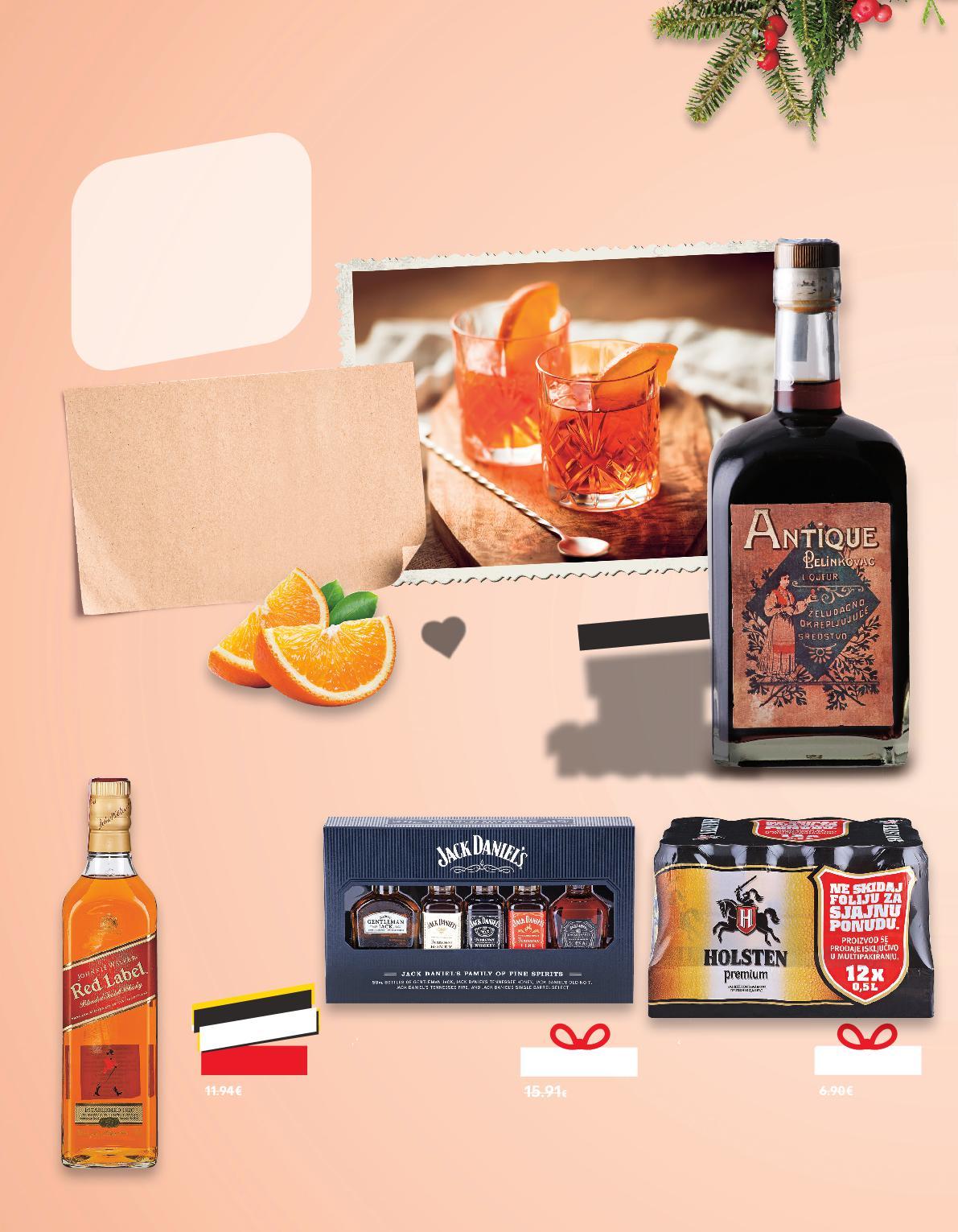 OD PONEDJELJKA, 19.12. PIĆE U čašu ulij Antique, iscijedi naranču i dobro promiješaj. Dodaj nekoliko kockica leda i ukrasi kriškom naranče. Ako želiš piće više u smjeru laganog koktela, ovu kombinaciju nadopuni mineralnom vodom ili tonikom po želji. PRIPREMA: Antique Pelinkovac cijeđena naranča par kockica leda kriške limuna SASTOJCI: ŠTRUKANIpelin mineralnom d ili tonikom po želji JOHNNIE WALKER Whisky Red Label udio alkohola 40% 0,7 l (=1 l 121,42 kn) samo SUPER CIJENA SUPERCIJENA UPER-5% 5% 84.99kn 11.28€ (=1 l 16,12€) HOLSTEN Svijetlo pivo udio alkohola 4% 12x 0,5 l (=1 l 8,67 kn) KRATKOTRAJNA PONUDA samo SUPERCIJENA KRATK AJNA SUPER CIJENAONUDAUPERPONUD ONUD S I E TKOTRAJNA 0% UPERCIJENA TKOTR 51.99kn 6.90€ (=1 l 1,15€) BADEL Pelinkovac antique udio alkohola 35% 0,7 l (=1 l 155,58 kn) (=1 l 20,65 €) KAUFLAND NISKA CIJENA KOMAD=4.34KN(0.58€) 15.91€ KRATKOTRAJNA PONUDA samo SUPERCIJENA KRATK AJNA SUPER CIJENAONUDAUPERPONUD ONUD CI ENA TKOTRAJNA 0% UPERCIJENA TKOTR 119.90kn JACK DANIEL`S Poklon paket Jack Daniel`s 40%, Jack Daniel`s Tennesse honey 35%, Jack Daniel`s Tennesse fire 35%, Gentleman Jack 40%, Jack Daniel`s Single barrel 45% 5x0,05 L 14.59€ Pelinkovac 108.90kn samo SUPER CIJENA KAUFLAND NISKA CIJENA NISKA S16-HR-KW51-LFT-NMP_2_L-1030-11 16