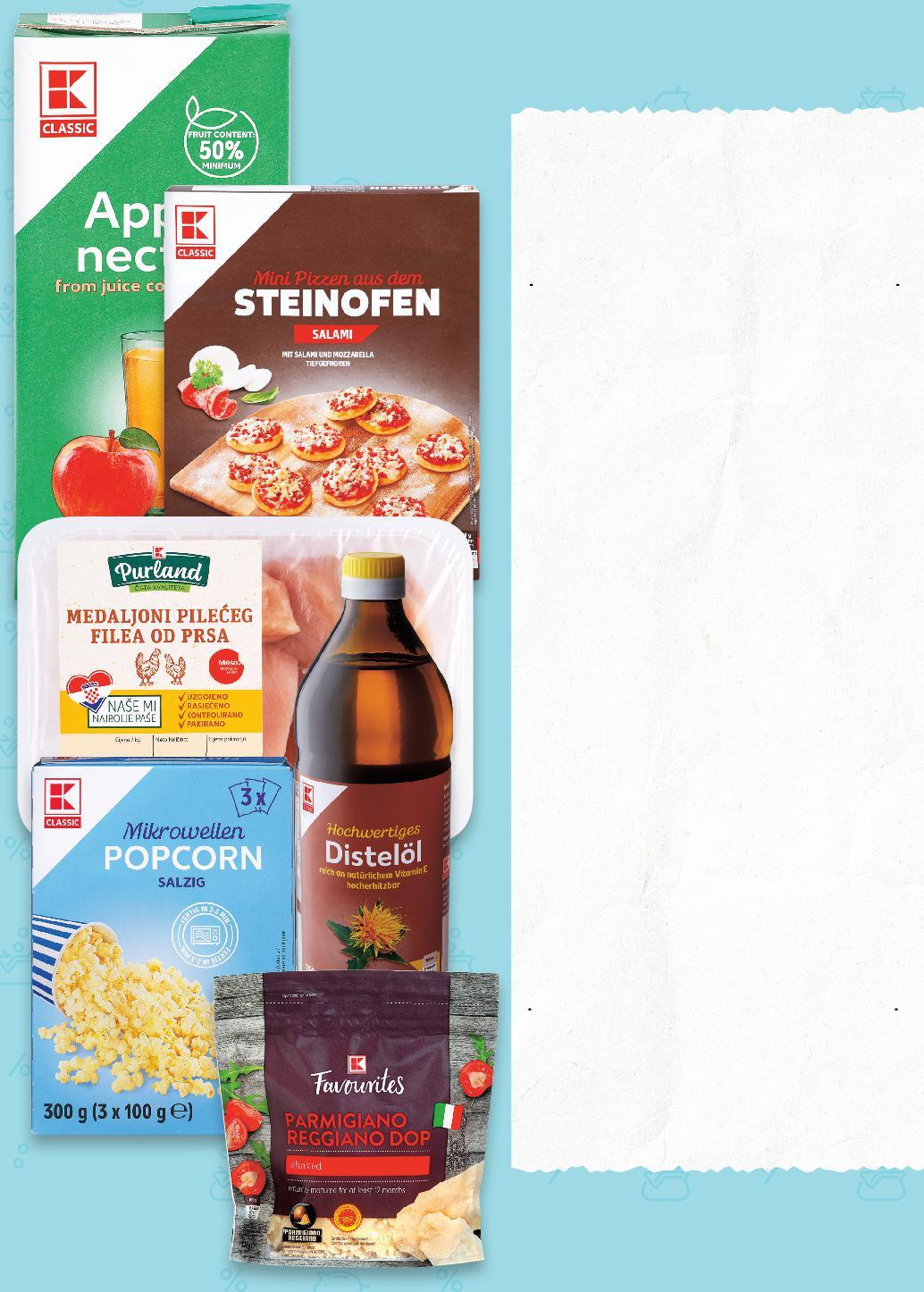 K-FAVOURITES ušteda -6.40kn -0.85€ Parmigiano Reggiano ploškice 125 g Mini pizza salama 360 g -5.71kn -0.76€ K-CLASSIC ušteda Kokice za mikrovalnu slane 3x 100 g -2.40kn -0.32€ K-CLASSIC ušteda -7.16kn -0.95€ K-PURLAND ušteda Pileći medaljoni filea od prsa svježe 400 g Voćni nektar jabuka udio voća 50% 2 l -3.00kn -0.40€ K-CLASSIC ušteda Ulje šafranike 750 ml -6.77kn -0.90€ K-CLASSIC ušteda S60-HR-KW13-LFT-PR_RS-1030-11 60