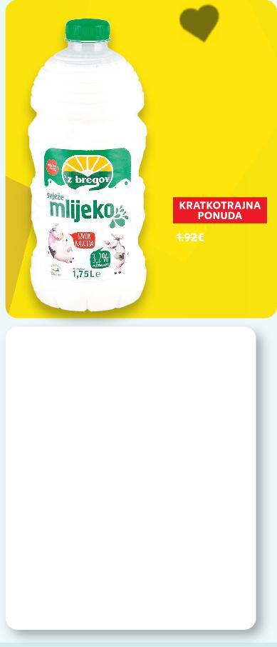 KRATKOTRAJNA PONUDA SUPERCIJENA ONUDA KRATKOTRAJNA PONUDA SUPERCIJENA ONUDA RIBA ✓ U Kauflandu pronađi više od 830 vrsta mliječnih proizvoda, poznatih i provjerenih domaćih i stranih marki. ✓ Također imamo više od 100 veganskih vrsta proizvoda od kojih izdvajamo odlične napitke za kavu ili žitarice! OMEGOL Margarinski namaz original ili sa sjemenkama lana bogat omega 3 esencijalnim kiselinama 250 g `Z BREGOV Svježe mlijeko 3,2% m.m. 1,75 L (=1 kg 39,96 kn) SUPER CIJENA-23% 9.99kn 12.99kn (=1 l 8,57 kn) samo SUPER CIJENA SUPERCIJENA UPER-0% 0% 14.99kn `Z BREGOV Fortia jogurt razni okusi 330 g (=1 kg 22,70 kn) 100 vrsta ak v Tak Ta SUPER CIJENA-21% 7.49kn 9.49kn CROMARIS Orada 600 g Kozice prokuhane 40/60 200 g LEDO Lignja Patagonika cijela, smrznuta 500 g (=1 kg 76,65 kn) (=1 kg 91,95 kn) (=1 kg 75,98 kn) samo SUPER CIJENA SUPERCIJENA UPER-0% 0% 45.99kn samo SUPER CIJENA SUPERCIJENA UPER-0% 0% 18.39kn SUPER CIJENA-26% 37.99kn 51.99kn 1.33€ 1.99€ 0.99€ 1.26€ 6.10€ 2.44€ 5.04€ 6.90€ KAUFLAND NISKA CIJENA 1.72€ ✓ očišćeno 1,75L (=1 kg 5,30€) (=1 kg 3,01€) (=1 kg 10,17€) (=1 l 1,14€) ALPRO Napitak badem sa ili bez šećera ili kokos s rižom 1 L (=1 kg 12,20€) (=1 kg 10,08€) KAUFLAND NISKA CIJENA KAUFLAND NISKA CIJENA 2.98€ 1.99€ .98 14.99kn -33% 22.49kn MLIJEČNI PROIZVODI S23-HR-KW48-LFT-FRP_1_D-1030-11 23