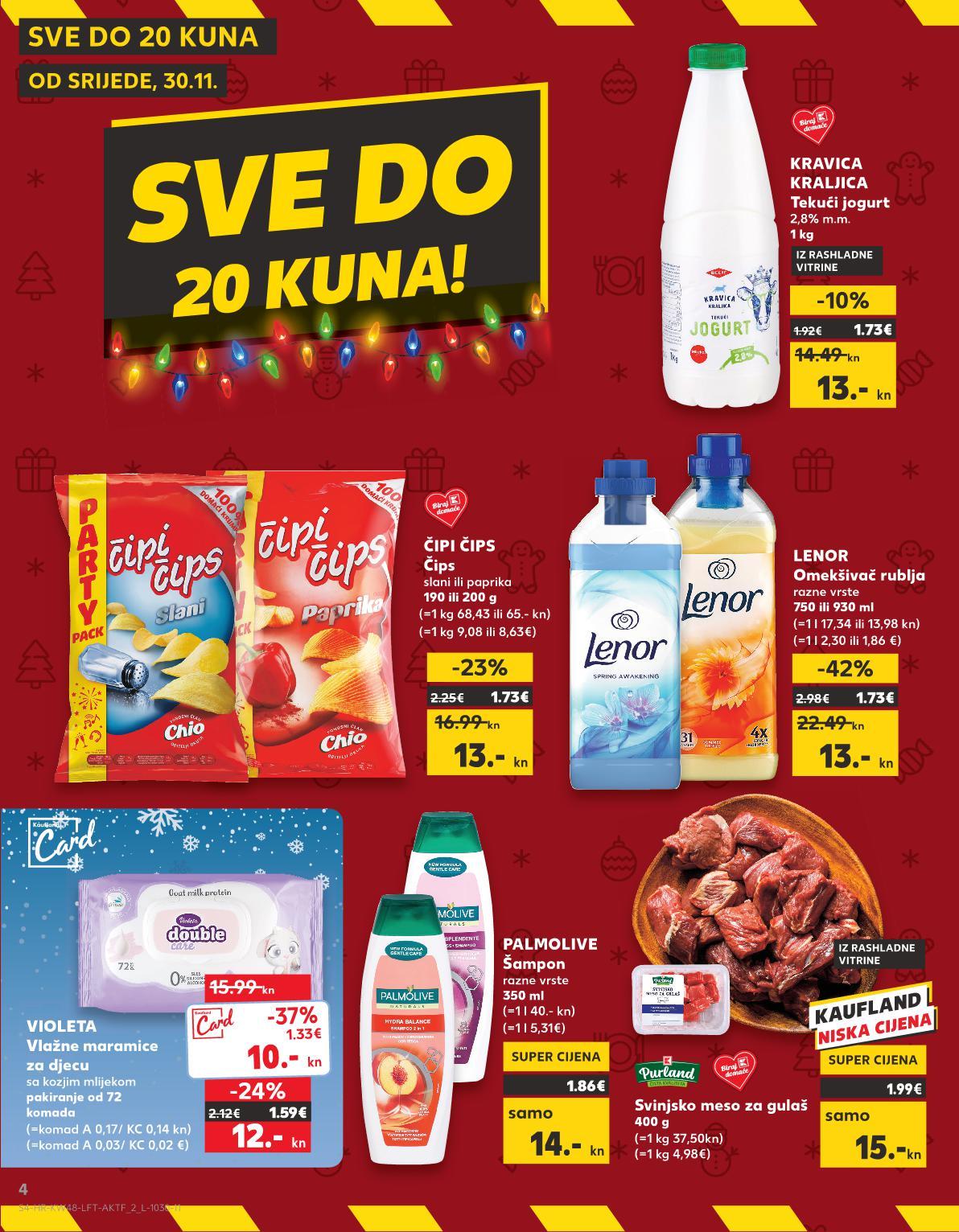 OD SRIJEDE, 30.11. SVE DO 20 KUNA SVE DO 20 KUNA! KUNA! (=komad A 0,03/ KC 0,02 €) Vlažne maramice za djecu sa kozjim mlijekom pakiranje od 72 komada (=komad A 0,17/ KC 0,14 kn) VIOLE IZ RASHLADNE VITRINE za TA ČIPI ČIPS Čips slani ili paprika 190 ili 200 g (=1 kg 68,43 ili 65.- kn) SUPER CIJENA-23% 13.- kn 16.99 kn 1.73€ 1.86€ (=1 l 40.- kn) samo SUPER CIJENA SUPERCIJENA UPER-0%UPER0% 14.- kn PALMOLIVE Šampon razne vrste 350 ml SUPER CIJENA -24% 12.- kn 15.99 kn 2.12€ 1.59€ Svinjsko meso za gulaš 400 g (=1 kg 37,50kn) samo SUPER CIJENA SUPERCIJENA UPER-0% 0% 15.-kn 1.99€ 10.- kn -37% 37 (=1 kg 4,98€) (=1 kg 9,08 ili 8,63€) LENOR Omekšivač rublja razne vrste 750 ili 930 ml (=1 l 17,34 ili 13,98 kn) SUPER CIJENA-42% 13.- kn 22.49 kn 2.98€ 1.73€ (=1 l 2,30 ili 1,86 €) (=1 l 5,31€) KRAVICA KRALJICA Tekući jogurt 2,8% m.m. 1 kg SUPER CIJENA-10% 13.- kn 14.49 kn 1.92€ 1.73€ IZ RASHLADNE VITRINE 1.33€ KAUFLAND NISKA CIJENA 2.25€ S4-HR-KW48-LFT-AKTF_2_L-1030-11 4