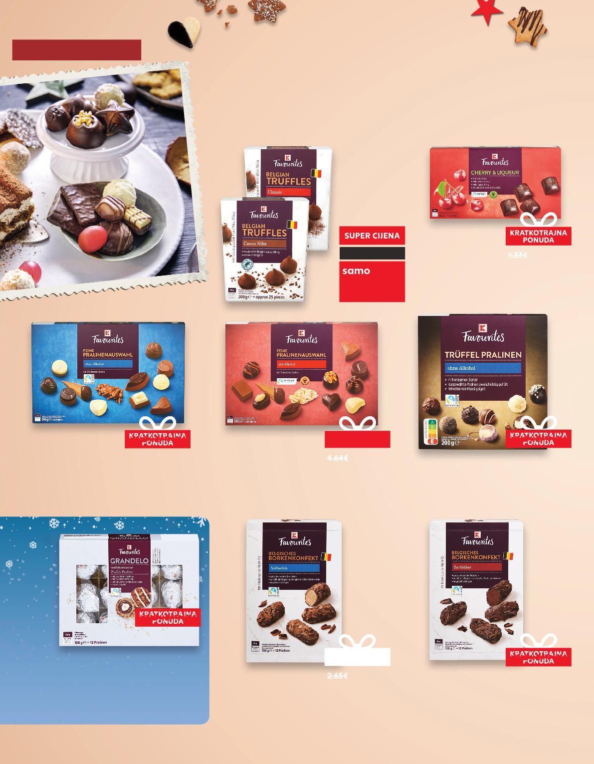 OD SRIJEDE, 30.11. SLATKIŠI 19.99kn -15% Praline mix 300 g Praline mix, s alkoholom 300 g Praline bez alkohola 200 g (=1 kg 116,64 kn) (=1 kg 116,64 kn) (=1 kg 109,95 kn) SUPER CIJENA-12% 34.99kn 39.99kn KRATKOTRAJNA PONUDA samo SUPERCIJENA KRATK AJNA SUPER CIJENAONUDAUPERPONUD ONUD TKOTRAJNA 0% UPERCIJENA TKOTR 34.99kn 5.31€ 4.64€ 4.64€ SUPER CIJENA-12% 21.99kn 24.99kn 2.92€ 3.32€ 2.65€ 2.25€ (=1 kg 113,27 kn) SUPER CIJENA-15% 16.99kn 19.99kn Praline punjene gorkom čokoladom 150 g 2.25€ (=1 kg 84,95 kn) 16.99kn Belgian truffles original ili cacao 200 g Praline mliječna čokolada 150 g 1.72€ (=1 kg 78,73 kn) samo SUPER CIJENA SUPERCIJENA UPER-0% 0% (=1 kg 113,27 kn) 12.99kn Praline liker od višnje 165 g OD 30.11. UŽIVAJ U VRHUNSKIM ZALOGAJIMA! NAŠA ROBNA MARKA K-FAVOURITES NUDI TI VIŠE OD 160 PRVOKLASNIH I UKUSNIH PROIZVODA ZA CIJELU OBITELJ KRATKOTRAJNA PONUDA samo SUPERCIJENA KRATK AJNA SUPER CIJENAONUDAUPERPONUD ONUD TKOTRAJNA 0% UPERCIJENA TKOTR 16.99kn 2.53€ 2.65€ (=1 kg 11,27€) (=1 kg 15,03€) (=1 kg 10,45€) (=1 kg 15,48€) (=1 kg 15,48€) (=1 kg 14,59€) (=1 kg 15,03€) (= 1 kg A 15,03 / KC 14,15€) K-Favourites Čokoladne kuglice 150 g (= 1 kg A 113,27 / KC 106,60 kn) SUPER CIJENA -15% 16.99kn 19.99kn 2.65€ 2.25€ 15.99kn -20% 20 2.12€ S10-HR-KW48-LFT-AKTF_5_L-1030-11 10