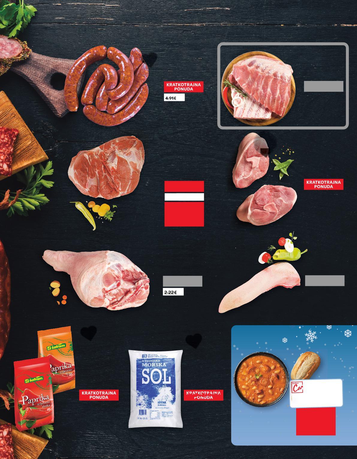 PONUDA VRIJEDI DO NEDJELJE, 4.12. ŽELIŠ DOMAĆE SPECIJALITETE? OVDJE DOBIJEŠ UVIJEK SVJEŽE PROIZVODE! Svinjska lopatica s kožom, u komadu bez kostiju, za sušenje 1 kg Svinjska rebra 1 kg Svinjska podlaktica s kostima 1 kg KRATKOTRAJNA PONUDA KRATKOTRAJNA PONUDA samo ATKOTRAJNAPONUD0% TKOTRAJNA ONUDA 22.99kn samoPONUD0% TKOTRAJNA ONUDA 18.99kn samo SUPER CIJENA SUPERCIJENA UPER-0% 0% 2.71€ 3.05€ 18.99kn Kobasica za sušenje svježa 1 kg samo SUPER CIJENA SUPERCIJENA UPER-0% 0% 36.99kn 4.91€ 2.25€ 2.52€ 2.52€ 2.52€ Juneći jezik 1 kg KRATKOTRAJNA PONUDA samo SUPERCIJENA KRATK AJNA SUPER CIJENAONUDAUPERPONUD ONUD TKOTRAJNA 9% UPERCIJENA TKOTR TKTR 33.99kn 4.51€ Svinjski but s kostima ravni rez, za sušenje 1 kg KRATKOTRAJNA PONUDA samoPONUD0% TKOTRAJNA ONUDA 20.99kn 2.79€ GMO FREE Grah s kobasicom + žemlja samo 34.99kn 27.99kn -20% 20 3.71€ 4.64€ s PAG 91 Morska sol kuhinjska, sitna 5 kg (=1 kg 2,40 kn) SUPER CIJENA-27% 11.99kn 16.49kn 1.59€ 2.19€ (=1 kg 0,32€) ŠAFRAM Paprika začinska mljevena slatka ili ljuta 500 g (=1 kg 71,98 kn) samo SUPER CIJENA SUPERCIJENA UPER-27% 27% UPERCIJENA 35.99kn 4.78€ (=1 kg 9,55€) s u komadu bez za 1 2 71 5 KG S21-HR-KW48-LFT-FLP_1_D-1030-11 21