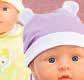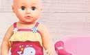 dolazi u 3 varijante: rozoj s kapicom, odjećom, ogrtačem i bočicom; fuxia s kapicom, odjećom, kahlicom i bočicom; na pruge u ogrtaču, bočicom i patkicom za kupanje. Dimenzija: 23cm