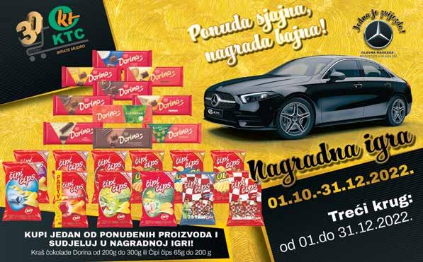 Poklon bonovi 30 x 1.000,00 kn ISKORISTIVI U BILO KOJOJ KTC POSLOVNICI! Glavnanagrada 5.000,00 kn Proslavi rođendan sa svojih 30 frendova u KTC restoranu u vrijednosti od Potroši preko 50 kn u KTC ugostiteljstvu i sudjeluj u nagradnoj igri! VIŠE INFORMACIJA O PRAVILIMA SUDJELOVANJA NA WWW.KTC.HR Na torti okrugao broj, ti primi poklon svoj! Na torti okrugao broj, ti primi poklon svoj! NAGRADNA IGRA KTC UGOSTITELJSTVA 01.02.2022.-14.01.2023. 1.KRUG - 01.02.-30.04.2022. 2.KRUG - 01.05.-31.07.2022. 3.KRUG - 01.08.-31.10.2022. 4.KRUG - 01.11.2022.-14.01.2023. 7x1000kn 7x1000kn 01.08.-31.10.2022. 7x1000kn 9x1000kn KTC UGOSTITELJSTVO Svakodnevno PRIPREMAMO SVJEŽA DOMAĆA I TOPLA JELA! Uz svaki kupljeni gablec: Coca Cola 0,25l 11,00kn-1,46€ 9,00kn-1,19€ 10,00kn-1,33€ Prilozi već od 6,00kn-0,80€! Salate već od 6,00kn-0,80€! IZDVAJAMO IZ DNEVNE PONUDE JELA!!! Sky Cola 0,33 VIŠE NA WWW.KTC.HR PONEDJELJAK 12.12.2022. GRAH ZELJE S KOBASICOM UTORAK 13.12.2022. SRIJEDA 14.12.2022. BEČARSKI PAPRIKAŠ PETAK 09.12.2022. CRNI RIŽOTO OD SIPE 23,00 kn 3,05EUR 23,00 kn 3,05EUR 29,00 kn 3,85EUR 23,00 kn 3,05EUR ČETVRTAK 08.12.2022. KUHANI BUNCEK 27,00 kn 3,58EUR POHANI SIR PILEĆA LJUTA KRILCA ILI BATACI SUBOTA 10.12.2022. 25,00 kn 3,32EUR Adventska ponuda Kobasice od divljači u pecivu 25,00 kn/3,32EUR - svaki dan! Burger s kobasicom od divljači u pecivu 30,00 kn/3,98EUR - svake srijede!