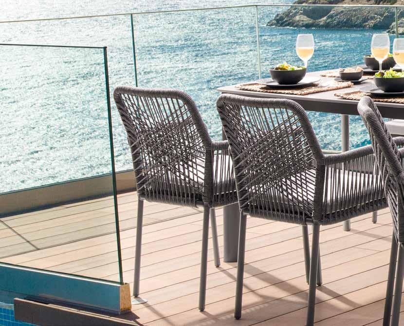 Vrtni stol Beja, konstrukcija od oplemenjenog četkanog čelika s pločom od kaljenog mat stakla u dekoru kamena dim.: 180x75x90 cm nosivosti do 60 kg. Vrtna stolica Lugano, složiva, konstrukcija od oplemenjenog četkanog čelika i masivnog drva tikovine s tekstilen tkaninom sive boje dim.: 54x85x63 cm nosivosti do 120 kg. (21060005/07;0003/01)