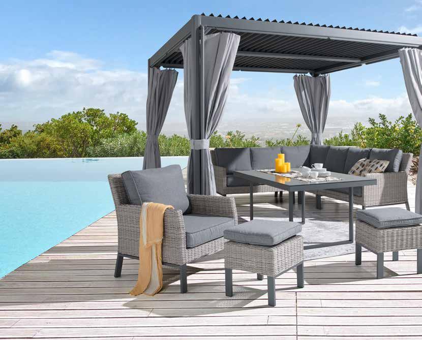 Lounge garnitura Lionel, čelična konstrukcija s PVC pletivom. Kut dimenzije 179x236 cm, sastoji se od lijeve strane dim.: 179x73x67 cm i desne strane dim.: 169x73x67 cm ukupne nosivosti do 840 kg. Svaki element može stajati samostalno, pa umjesto kutne garniture možete imati i dva trosjeda. U sastavu garniture je i veliki stol sa staklenom pločom dim.: 145x67x76 cm nosivosti do 50 kg te dva taburea dim.: 40x39 nosivosti do 120 kg. Svijetlo sivi jastuci za sjedenje i naslon su uključeni u cijenu. Ukrasni jastučići uz nadoplatu. (16940027/09)