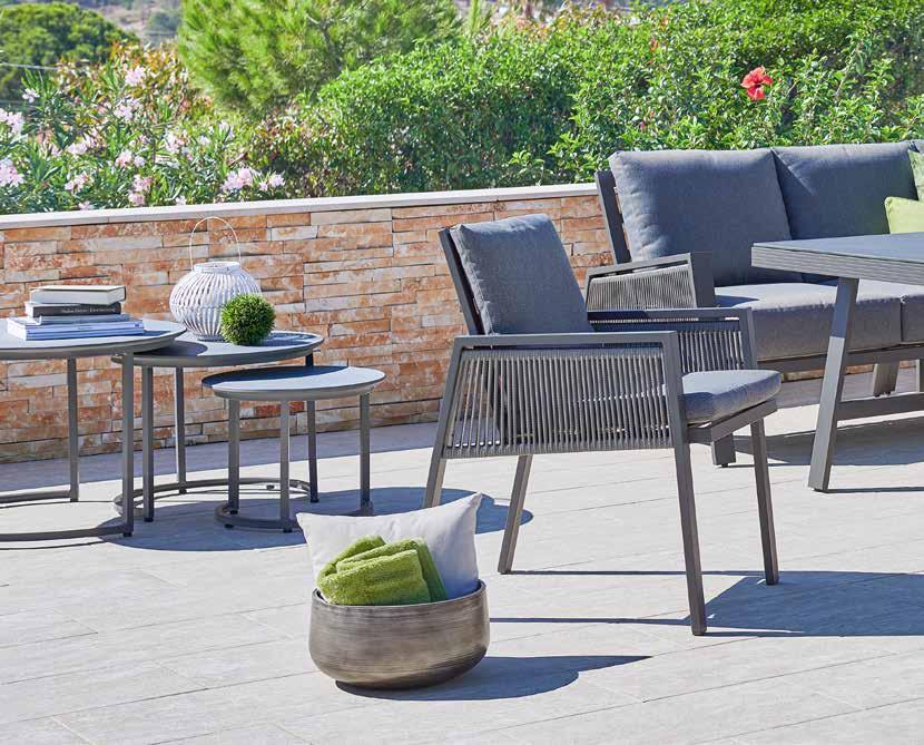 Vrtni stol Beida , konstrukcija od plastificiranog aluminija u antracit boji s keramičkom pločom u dekoru kamena sive boje dim: 180x75x90 cm nosivosti do 60 kg. Vrtna stolica Hela Grey J2288, konstrukcija od plastificiranog aluminija presvučena PVC pletivom s izgledom ratana. U cijenu su uključeni jastuci za sjedenje s odvojivom navlakom u sivoj boji dim.: 55x85x62 cm nosivosti do 120 kg. (21060007/07;0008/01)