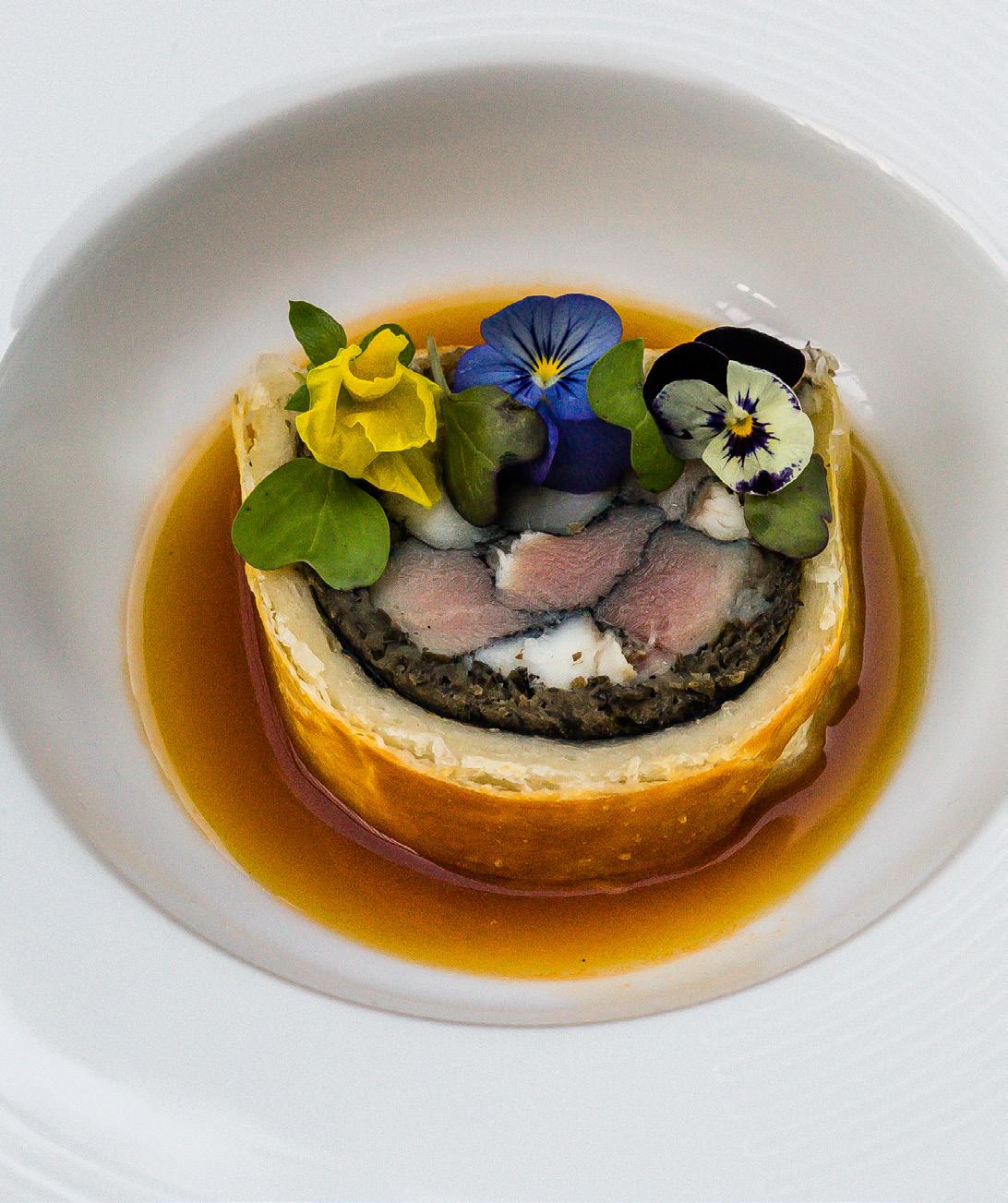 11 CRNILO SIPE cijena za 2x4 g 4,49 (5,61) kn 0,60 (0,74) € PODRAVKA KONCENTRAT RAJČICA cijena za 190 g 9,59 (11,99) *(12,49) kn 1,27 (1,59) € WEWALKA LISNATO TIJESTO cijena za 275 g 6,99 (8,74) *(9,99) kn 0,93 (1,16) € CRNILO SIPE cijena za 500 g 69,99 (87,49) kn 9,29 (11,61) € VICELIĆ DINGAČ cijena za 0,75 l 89,99 (112,99) *(112,99) kn 11,94 (15,00) € Ponuda od 27. listopada do 23. studenog 2022. #metrofoodie PripremaSastojci 1. Crnilo sipe namazati na papir za pečenje i dehidrirati u pećnici na 70°C cca. 1h. U mužaru osušeno crnilo samljeti u prah. 2. Brancin filetirati i narezati na trakice približno jednake dužine, širine cca. 0,5 cm. 3. Tunu također narezati na jednake trakice. Začiniti sa solju. 4. Obložiti trakice ribe prahom od crnila sipe i posložiti jedan na drugi cca. 12 komada. 5. Posložiti 3 lista prijanjajuće folije čvrsto jednu na drugu te na to složiti trakice ribe i zarolati u „kobasicu“. Čvrsto zavezati. 6. Sous vide tehnikom obraditi ribu (26 minuta na 46°C), prebaciti u ledom ohlađenu vodu i ostaviti u hladnjaku preko noći. 7. Crnu leću skuhati, začiniti i u blenderu pretvoriti u pire. Dodati malo maslaca kako bi pire bio maziv. 8. Na nori algu u tankom sloju namazati pire pa na to staviti riblji mozaik i zarolati kao sushi te opet stisnuti u prijanjajuću foliju i staviti u hladnjak na 1 sat. 9. Razvaljati lisnato tijesto na debljinu 0,5 cm debljine, zarolati riblju „kobasicu“, dobro zatvoriti i premazati žumanjkom. 10. Staviti u prethodno zagrijanu pećnicu na 190°C dok ne dobije zlatno žutu boju. Izvaditi i odmoriti 5 minuta. 11. Za riblji Demi Glace, najprije povrće zapeći na visokoj temperaturi u pećnici, pa prebaciti u lonac s jako malo ulja. 12. Dodati koncentrat rajčice i još malo termički obraditi, dodati bijelo vino i kuhati dok alkohol ne ispari. 13. Riblje kosti staviti u pećnicu na visoku temperaturu dok se ne ispeku, potrebna je jako tamno smeđa boja pa prebaciti u lonac s povrćem. 14. Deglazirati bijelim vinom i dodati u lonac. 15. Napuniti lonac vodom, dodati ružmarin, lovor, sol i papar u zrnu te kuhato na laganoj vatri 2-3 sata. 16. Procijediti tekućinu kroz gazu kako bi se riješili i najmanjih čestica te vraćati na laganu vatru još 4-5 sati ili dok se količina ne smanji na 1/3 originalne. 17. Konstantno sa žlicom mičemo masnoću sa površine kod se kuha. 18. Staviti u hladnjak kako bi se umak stisnu te ga malo zagrijati prije posluživanja. 19. Jelo ukrasiti s jestivim cvijećem i mikrozelenjem po izboru. • Metro Chef brancin • tuna file • 20 g crnila sipe • crna leća • nori alge • maslac • ARO lisnato tijesto • jestivo cvijeće • mikrozelenje • luk • celer korijen celera • češnjak • mrkva • bijelo vino • koncentrat rajčice • ružmarin svježi • lovor list • papar u zrnu TUNA FILET odmrznuti cijena za kg 103,99 (129,99) kn 13,80 (17,25) € KOTANYI LOVOROV LIST cijena za 5 g 3,59 (4,49) *(6,24) kn 0,48 (0,60) € SAITAKU MORSKE ALGE SUSHI NORI cijena za 14 g 9,99 (12,49) *(14,99) kn 1,33 (1,66) € METRO CHEF BRANCIN cijena za 1-1,5 kg 114,99 (120,74) kn 15,26 (16,02) € vinogorje Pelješac vrhunsko suho vino; crveno 18°C uz jela od mesa ili odležane sireve