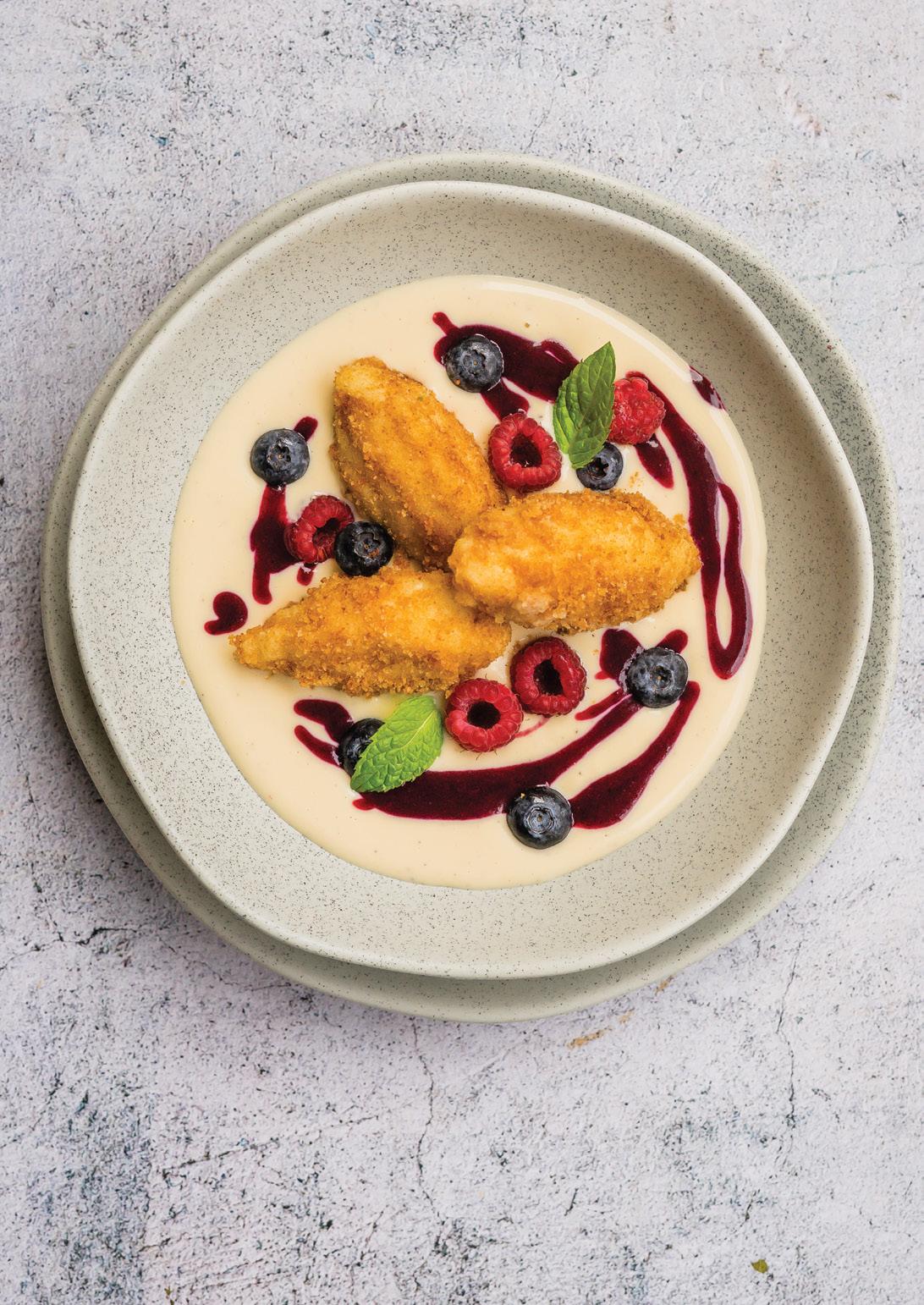 12 #metrofoodie Cijene su izražene u kunama i eurima po tečaju 1€ = 7,5345 kn. *najniža cijena u zadnjih 30 dana s PDV-om PripremaSastojci 1. Za knedle pomiješati sve sastojke i umijesiti tijesto. 2. Tijesto će biti ljepljivo. 3. Pomoću dvije žlice napraviti žličnjake. 4. Vodu staviti u lonac i malo posoliti. 5. Pustiti da zakipi te dodati knedle. 6. Knedle su gotove kad isplivaju na površinu. 7. Ocijediti ih i staviti u posudu. 8. Za umak od vanilije slatko vrhnje zajedno sa sjemenkama vanilije zagrijati na laganoj vatri. 9. Žumanjke izmiksati s gustinom i šećerom. 10. Dio zagrijanog vrhnja dodati u žumanjke kako bi ih temperirali, a zatim sve uliti u ostatak vrhnja i vratiti na vatru. 11. Uz stalno miješanje kuhati dok se ne zgusne. 12. Za coulis sastojke staviti u lonac te miješati na laganoj vatri dok se šećer ne otopi, a voće ne omekša, otprilike 4-5 minuta. 13. Maknite s vatre i izmiksajte štapnim mikserom dok ne dobijete masu nalik pireu. 14. Procijediti kroz sitno sito kako bi se odstranile sitne koštice. 15. U tavi otopiti maslac te na njega dodati krušne mrvice. 16. Pržiti ih uz stalno miješanje dok ne potamne. 17. Knedle uvaljati u krušne mrvice. 18. U dublji tanjur uliti kremu od vanilije, dodati knedle te umak od borovnica i malina. 19. Dekorirati svježom mentom. Sastojci za knedle: • 400 g skute • 2 jaja • 5 žlica griza • 5 žlica oštrog brašna • 30 g otopljenog maslaca • korica jednog limuna • prstohvat soli Sastojci za umak od vanilije: • 300 ml slatkog vrhnja • sjemenke mahune vanilije ili ekstrakt vanilije • 3 žumanjka • 1 žlica gustina • 30 g šećera Sastojci za coulis od borovnica i malina: (agava ili javorov sirup) • 200 g borovnica • 200 g malina • 2 žlice šećera • 2 žlice vode Dodatno: • krušne mrvice • maslac DR.OETKER GUSTIN XXL cijena za 400 g 9,99 (12,49) *(15,36) kn 1,33 (1,66) € DEGARRA PJENUŠAVO VINO PRIMO cijena za 0,75 l 113,99 (142,99) *(146,49) kn 15,13 (18,98) € METRO CHEF LIMUN BIO cijena za 500 g 17,29 (18,15) *(19,10) kn 2,29 (2,41) € ARO VRHNJE ZA ŠLAG 30% m.m. cijena za 1 kg 27,99 (34,99) *(37,49) kn 3,71 (4,64) € ‘Z BREGOV MASLAC cijena za 500 g 39,99 (41,99) *(50,39) kn 5,31 (5,57) € PAŠKA KRAVLJA SKUTA cijena za 400 g 15,98 (19,98) *(19,99) kn 2,12 (2,65) €