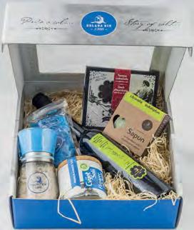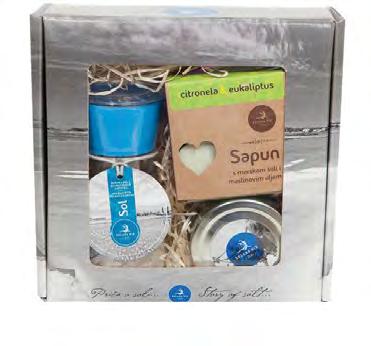 maslinovo ulje 200 ml, cvijet soli 125 g, mlinac sol sa dalmatinskim začinima 170 g, čokolada sa cvijetom soli 60 g, sapun sa soli citronela & eukaliptus 125 g, mirisna sol more zip 130 g