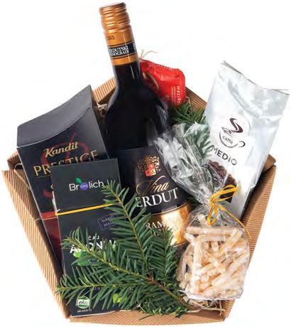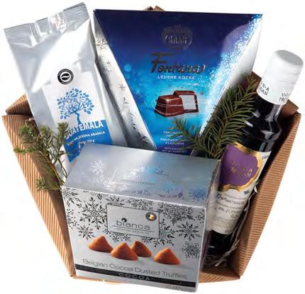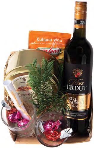 0,75 l Erdut traminac kvaliteno vino 100 g kava za domaćinstvo mljevena 100 g arancini 80 g Kraš čokolada 30 g čaj aronija 100 g Prestige dragee