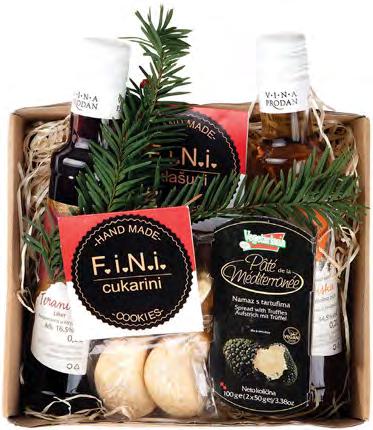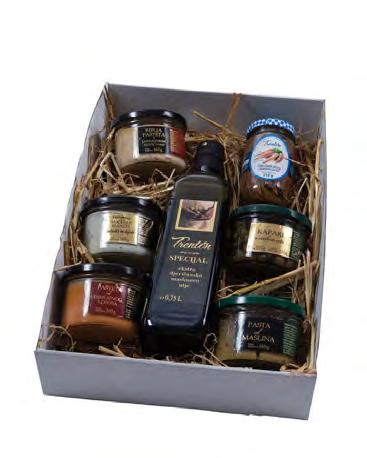 namaz od jadranskih kozica 165 g, namaz od dimljenog lososa 165 g, namaz od bakalara 165 g, pasta od zelenih maslina 165 g, kapari u octu 195 g, fileti slanih inćuna u maslinovom ulju 212 g, maslinovo ulje ekstra djevičansko 0,75 l specijal