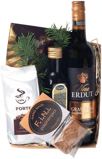 0,75 l erdut zweigelt kvalitetno vino 150 g kraš bajadera 250 ml extra djevičansko maslinovo ulje 100 g kava za domaćinstvo mljevena 50 g domaći rukom rađeni keksi
