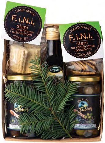 0,25 l extra djevičansko maslinovo ulje 370 ml Tribunj masline zelene i crne (2 komada) 50 g domaći slani keksi s maslinama 50 g domaći slani keksi sa ružmarinom