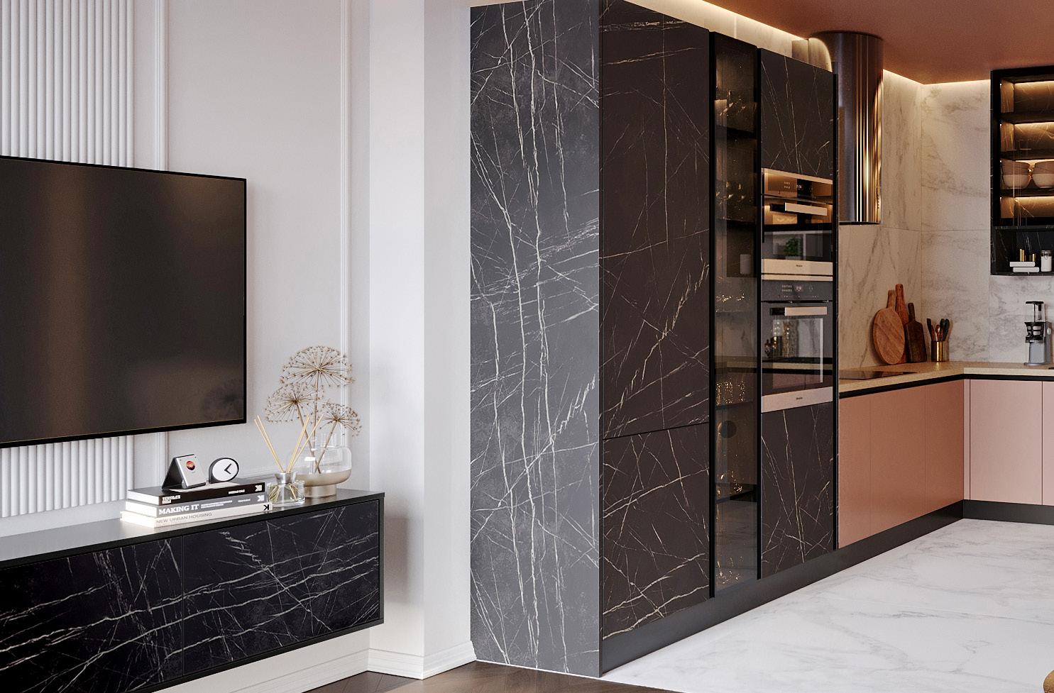velik izbor dekora radnih ploča i zidnih obloga • cijena se odnosi na osnovni sastav* kuhinje Evolution i RTV-a u dekorima Espirit Grigio pietra + Espirit Antique Rose
