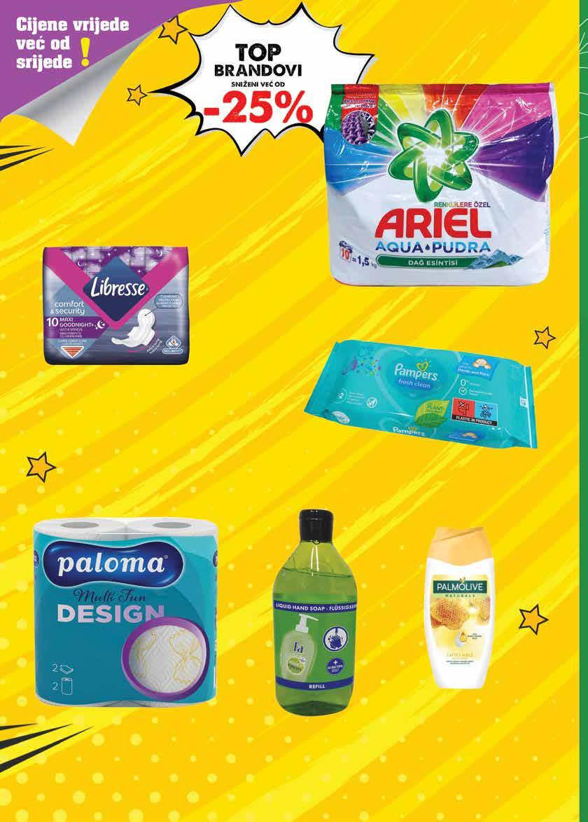 18 19 www.ntl.hr www.ntl.hr Cijene vrijede već od srijede ! ! Cijene vrijede već od srijede Šampon za kosu Frutella, 1 l Salvete u boji breskva, vanilija Ceba, 2-sl., 50 kom 1 kom = 0,02 EUR / 0,15 kn Vlažni toaletni papir Ceba, 60 kom 1 kom = 0,01 EUR / 0,08 kn Vlažne maramice za bebe Bellesa, 20 kom 1 kom = 0,02 EUR / 0,23 kn 1 pak Higijenski ulošci dnevni Femme, 30 kom 1 kom = 0,04 EUR / 0,30 kn -17% 50 16 kn 219 EUR 265 EUR 1997 kn -12% 46 7 kn 099 EUR 113 EUR 851 kn -30% 95 5 kn 079 EUR 113 EUR 851 kn -33% 99 7 kn 106 EUR 159 EUR 1198 kn Na DOVE asortiman* *vrijedi za odabrane, označene proizvode -25% Na NIVEA DEO asortiman* *vrijedi za odabrane, označene proizvode -30% 94 2 kn 039 EUR IZ PONUDE IZDVAJAMO Deterdžent za pranje posuđa Čarli, 450 ml 1 = 2,64 EUR / 19,89 kn Deterdžent za pranje rublja Woosh, 8 kg 1 kg = 0,81 EUR / 6,10 kn Odstranjivač mrlja Liquid pink Vanish, 500 ml 1 = 4,98 EUR / 37,52 kn Osvježivač za WC Bref, 150 g (3 x 50 g) 1 kom = 1,53 EUR/11,53 kn 1 kg = 30,60 EUR / 230,56 kn -14% 97 8 kn 119 EUR 139 EUR 1047 kn -24% 90 48 kn 649 EUR 863 EUR 6502 kn -19% 58 34 kn 459 EUR 571 EUR 4302 kn 76 18 kn 249 EUR 21 8 kn 109 EUR IZ PONUDE IZDVAJAMO Kvačice* 30 kom 1 kom = 0,04 EUR / 0,30 kn 1 pak Toaletni papir Classic Paloma, 3-sl., 10 rola 1 rola = 0,20 EUR / 1,51 kn Kupka Fa, 750 ml 1 = 5,32 EUR / 40,08 kn Šampon, regenerator Syoss, 440 ml 1 = 9,98 EUR / 75,19 kn Pelene za bebe Pampers Active baby Maxi pack, 70kom 1 kom =0,28€/ 2,11kn Maxi pack, 62kom 1 kom =0,32€/2,41kn Maxi pack, 54kom 1 kom= 0,37€/ 2,79kn Pasta za zube Family Cledent, 75 ml 1 l = 9,20 EUR / 69,32 kn 99 14 kn 199 EUR 11 149 kn 1979 EUR -34% 20 5 kn 069 EUR 106 EUR 799 kn -17% 08 33 kn 439 EUR 531 EUR 4001 kn 06 30 kn 399 EUR IZ PONUDE IZDVAJAMO Omekšivač za rublje Ornel, 2,4 2 = 1,83 EUR / 13,79 kn -33% 08 33 kn 439 EUR 663 EUR 4995 kn 30 kom