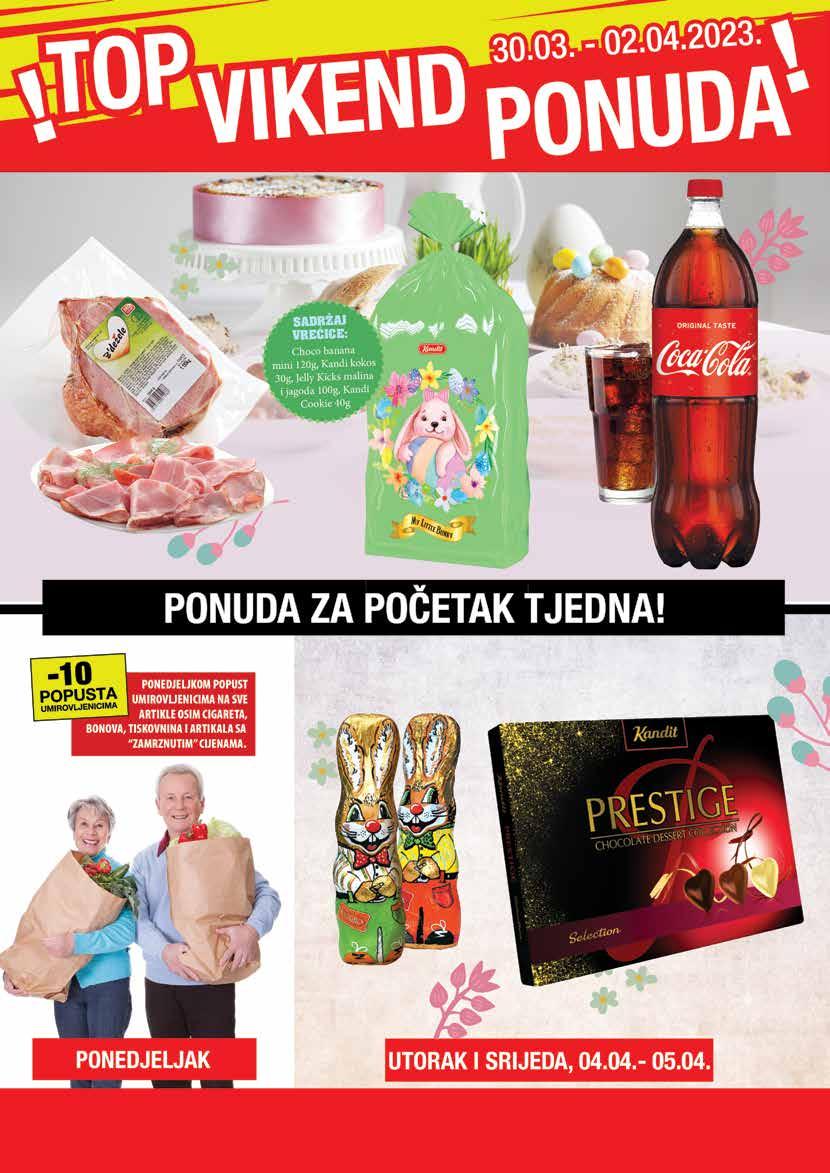 https://ntl.hr/obavjest/eticki-kodeks-578 Gazirano piće Coca Cola, 2 l 1 l = 0,93 EUR / 7,01 kn Vrat svinjski dimljeni Celjske M., 1 kg Bombonijera Prestige Selection Kandit, 150 g 1 kg = 20,33 EUR / 153,18 kn Čokoladni zec Cosmo, 60 g 1 kg = 9,83 EUR / 74,06 kn 94 13 kn 185 EUR 97 19 kn 265 EUR 98 22 kn 305 EUR 45 4 kn 059 EUR 4362 kn 579 EUR Ponuda vrijedi u svim marketima i supermarketima društva Narodni trgovački lanac d.o.o., vrijedi od 30.03. - 05.04.2023. ili do isteka zaliha. Moguće je da pojedini proizvodi nisu dostupni u svim prodajnim mjestima. Cijene su izražene u kunama. Za eventualne tiskarske pogreške ne preuzimamo odgovornost. Fotografije ne moraju u potpunosti odgovarati stvarnom izgledu proizvoda. Moguće su pogreške u objavljenom materijalu. Kupci se pozivaju da točne cijene provjere kod trgovaca. Zbog ograničenosti prostora svi proizvodi nisu dostupni u svim NTL trgovinama. Uskrsna vrećica Kandit, 290 g 1 kg = 9,14 EUR / 68,87 kn