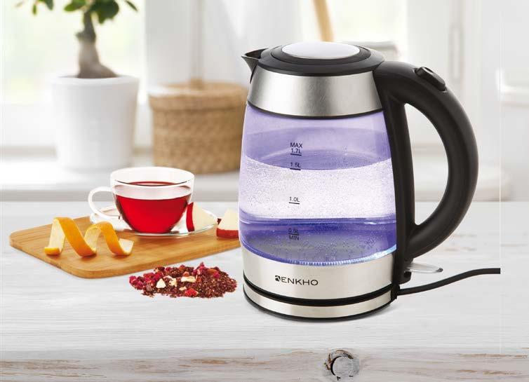 Zapremnina 1,7 L, sadrži automatsko isključivanje, filter protiv kamenca, 360° okretnu bazu s LED svjetlom, snaga 1850 - 2200 W.