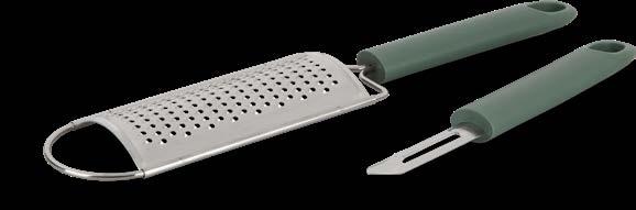Od nehrđajućeg čelika s drškom od materijala na BIO bazi, dimenzije gulilice 21 cm, dimenzije ribeža 6 x 30 cm.