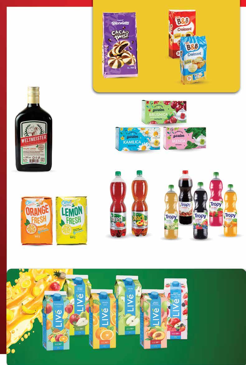 LIVE Voćni nektar razne vrste 2 l WELTMEISTER Biljni liker udio alkohola 30% 0,7 l TROPY Sirup razne vrste 1 l PLODINE Ledeni čaj breskva ili šumsko voće 1,5 l CITRA Vitaminski napitak naranča ili limun 1 kg GARDEN Čaj razne vrste 20 - 40 g BISCOLETTI Keks punjeni kakao Twist 700 g B&B Croissanti čokolada ili vanilija 210 g 2.91 € 21.93 kn 1.45 € 10.93 kn 1 kg = 6,90 € / 52,05 kn 0.64 € 4.82 kn 1 kg = 16,00 - 32,00 € / 1 kg = 120,50 - 241,00 kn Prilika vikenda!Super prilika! Prilika tjedna! 0.89 € 6.71 kn 1 l = 0,59 € / 4,47 kn x 8.97 kn -25% 1.19 € Prilika vikenda!Super prilika! Prilika tjedna! 1.45 € 10.93 kn x 12.96 kn -15% 1.72 € Prilika vikenda!Super prilika! Prilika tjedna! 2.12 € 15.97 kn 1 kg = 3,03 € / 22,81 kn x 25.01 kn -36% 3.32 € Prilika vikenda!Super prilika! Prilika tjedna! 1.19 € 8.97 kn 1 l = 0,60 € / 4,49 kn x 11.00 kn -18% 1.46 € Prilika vikenda!Super prilika! Prilika tjedna! 3.98 € 29.99 kn 1 l = 5,69 € / 42,84 kn x 40.01 kn -25% 5.31 € Fotografije proizvoda ne moraju u potpunosti odgovarati stvarnom izgledu proizvoda. Kupnja je moguća samo u količinama primjerenim za kućanstvo. Sve navedene cijene izražene su u eurima i kunama s PDV-om. Fiksni tečaj konverzije €/kn: 7,53450. Ne odgovaramo za tiskarske pogreške. 4
