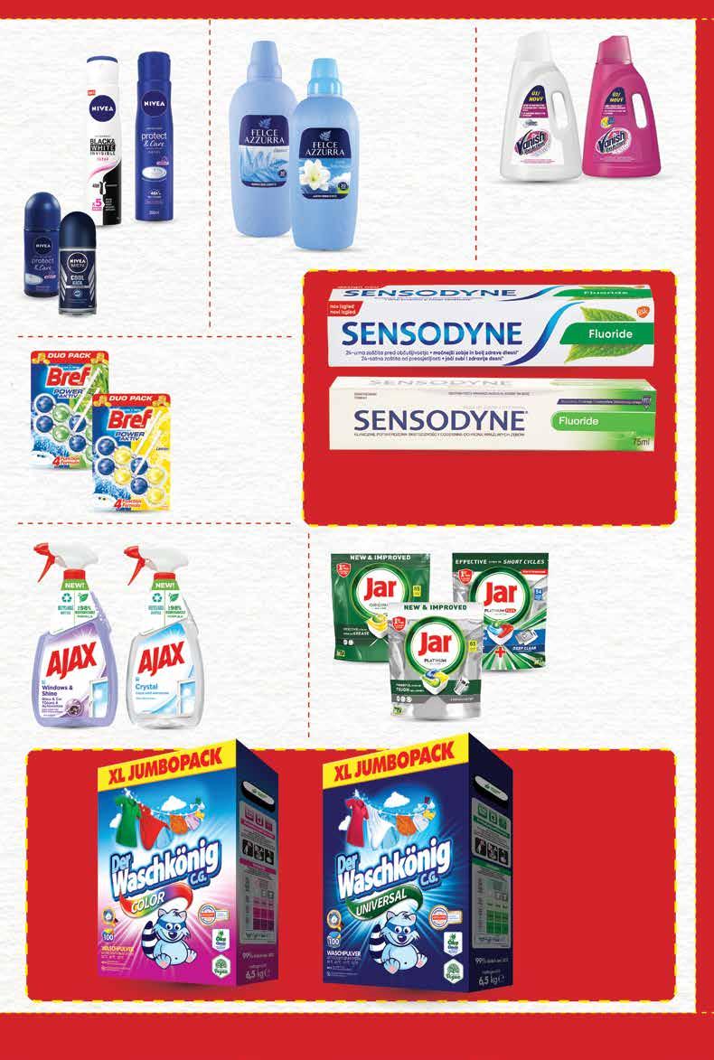 NIVEA Dezodorans, roll on ili stick razne vrste 150,50 ili 40 ml sniženi 50% NIVEA Dezedorans, roll on ili stick odabrani proizvodi 150, 50 ili 40 ml -50% WASCHKONIG Deterdžent za rublje razne vrste 6,5 kg SENSODYNE Zubna pasta Fluoride 75 ml BREF Wc osvježivač odabrane vrste Classic 2x 50 g Super prilika! Prilika tjedna! 2.19 € 16.50 kn 33.00 kn -50% 4.38 € 1 kg = 21,90 € / 165,00 kn FELCE AZZURRA Omekšivač rublja razne vrste 2 l Super prilika! Prilika tjedna! 1.69 € 12.73 kn 25.99 kn -51% 3.45 € 1 l = 0,85 € / 6,37 kn VANISH Odstranjivač mrlja razne vrste 3 l Super prilika! Prilika tjedna! 6.59 € 49.65 kn 99.98 kn -50% 13.27 € 1 l = 2,20 € / 16,55 kn NIVEA Dezodorans, roll on ili stick razne vrste 150,50 ili 40 ml sniženi 50% AJAX Sredstva za čišćenje odabrani proizvodi 500 - 750 ml -50% JAR Tablete za perilicu posuđa 85, 65 ili 54 komada Super prilika! Prilika tjedna! 11.89 € 89.59 kn 179.32 kn -50% 23.80 € 1 kom = 0,14 - 0,22 € / 1 kom = 1,05 - 1,66 kn Super prilika! Prilika tjedna! 2.25 € 16.95 kn 33.98 kn -50% 4.51 € 1 l = 30,00 € / 226,00 kn Super prilika! Prilika tjedna! 9.95 € 74.97 kn 150.01 kn -50% 19.91 € 1 kg = 1,53 € / 11,53 kn Fotografije proizvoda ne moraju u potpunosti odgovarati stvarnom izgledu proizvoda. Kupnja je moguća samo u količinama primjerenim za kućanstvo. Sve navedene cijene izražene su u eurima i kunama s PDV-om. Fiksni tečaj konverzije €/kn: 7,53450. Ne odgovaramo za tiskarske pogreške. 7