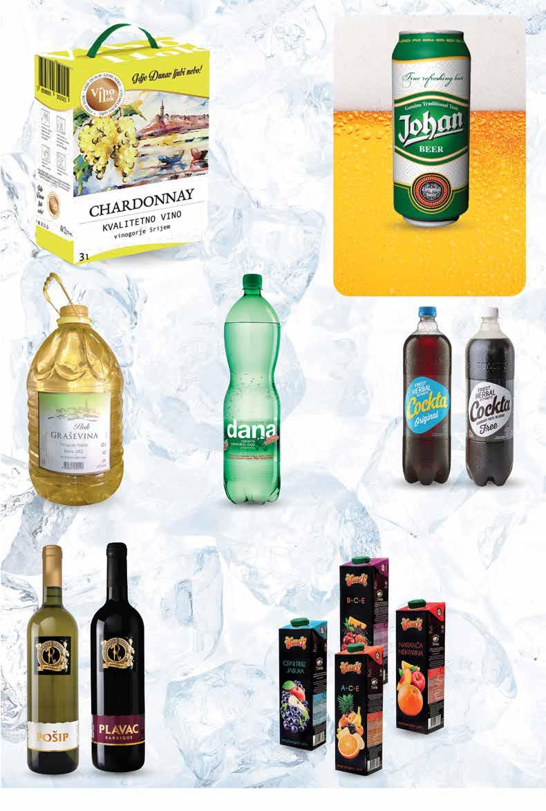 JOHAN Svijetlo pivo udio alkohola 4% 0,5 l VINO ILOK Chardonnay bijelo kvalitetno vino 3 l COCKTA Gazirani napitak Original ili Free 1,5 l DANA Prirodna mineralna voda gazirana 1,5 l VINARIJA ROSO Plavac Barrique ili Pošip bijelo ili crno kvalitetno vino 0,75 l Gastro preporuka: Uz jela s roštilja, plavu ribu, brudet ili razne sireve 10°-18°C Gastro preporuka: Uz mesne plate 0.59 € 4.45 kn 50% sniženoSuper svježa prilika!Štedi više! Plati manje! HIT cijena! 1 l = 1,18 € / 8,90 kn VINDI Voćni sok ACE, BCE, crni ribiz-jabuka ili naranča-nektarina 1 l 0.93 € 7.01 kn Super prilika! Prilika tjedna! 5.29€ 39.86 kn 70.00 kn -43% 9.29 € 1 l = 1,76 € / 13,29 kn Super prilika! Prilika tjedna! 3.19€ 24.04 kn 34.96 kn -31% 4.64 € 1 l = 4,25 € / 32,05 kn Super prilika! Prilika tjedna! 3.45€ 25.99 kn 40.01 kn -35% 5.31 € 1 l = 1,15 € / 8,66 kn 1.45 € 10.93 kn 1 l = 0,97 € / 7,29 kn Super prilika! Prilika tjedna! 0.49€ 3.69 kn 5.50 kn -32% 0.73 € 1 l = 0,33 € / 2,46 kn ČOBANKOVIĆ Graševina bijelo vino 3 l 3 l 3 l Fotografije proizvoda ne moraju u potpunosti odgovarati stvarnom izgledu proizvoda. Kupnja je moguća samo u količinama primjerenim za kućanstvo. Sve navedene cijene izražene su u eurima i kunama s PDV-om. Fiksni tečaj konverzije €/kn: 7,53450. Ne odgovaramo za tiskarske pogreške. 21