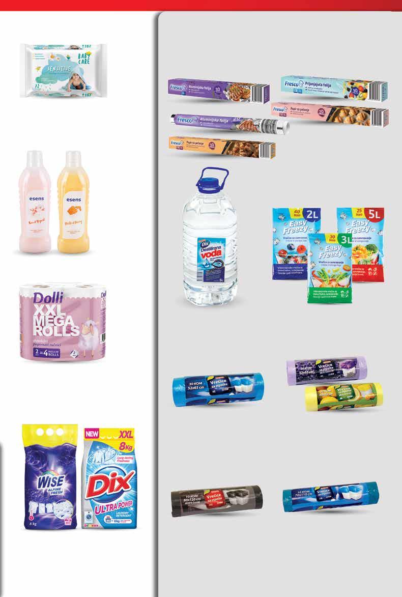 BABY CARE Baby vlažne maramice pakiranje od 72 komada DOLLI Kuhinjski ručnici dvoslojni 100 listića pakiranje od 2 role ESENS Tekući sapun razne vrste 1 l WISE I DIX Deterdžent za rublje Alpine fresh 8 kg DIX Destilirana voda zapremnina cca 5 l Vreća za smeće • s mirisom lavande ili limuna • zapremnina 40 l • dimenzije 52x65 cm • 30 komada u rolici Vreća za smeće • zapremnina 120 l • dimenzije 70x110 cm • pakiranje 10 komada u roli Vreća za smeće • zapremnina 40 l • dimenzije 52x65 cm • 30 komada u roli Vreća za smeće • zapremnina 150 l • dimenzije 80x120 cm • 10 komada u roli Vrećice za zamrzavanje • zapremnine 2 l, 3 l ili 5 l FRESCO odabrani proizvodi do -20% 0.46 € 3.47 kn 1.46 € 11.00 kn 1.59 € 11.98 kn 1.72 € 12.96 kn 2.79 € 21.02 kn Prilika vikenda!Super prilika! Prilika tjedna! 0.99 € 7.46 kn 1 l = 0,20 € / 1,49 kn x 14.99 kn -50% 1.99 € Prilika vikenda!Super prilika! Prilika tjedna! 1.29 € 9.72 kn 1 rola = 0,65 € / 4,86 kn x 19.97 kn -51% 2.65 € Prilika tjedna! Prilika vikenda! 00.99 kn -00% 0.99 € Super prilika! 0.79 € 5.95 kn 1 kom = 0,01 € / 0,08 kn Prilika tjedna! Prilika vikenda! 00.99 kn -00% 0.99 € Super prilika! 9.28 € 8 kg 69.92 kn 1 kg = 1,16 € / 8,74 kn A B C D A B C D A B C D A B C D A B C D A B C D A B C D Prilika tjedna! Prilika vikenda! 00.99 kn -00% 0.99 € Super prilika! 1.05 € 1 l 7.91 kn NAŠE ROBNE MARKE