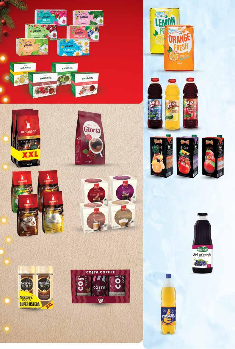 ARABESCA Kava mljevena 2x 500 g 1 kg = 59,99 kn 1 kg = 7,96 € GLORIA Kava mljevena 400 g 1 kg = 67,48 kn 1 kg = 8,95 € CITRA Vitaminski napitak naranča ili limun 1 kg FRANCK Kava Nota kapsule razne vrste 112 - 192 g 1 kg = 161,57 - 285,63 kn 1 kg = 21,46 - 37,95 € VINDI Voćni sok multivitamin ACE, BCE ili jabuka nektar 2 l 1 l = 6,00 kn 1 l = 0,80 € MIXI Sirup razne vrste 1 l ORANGINA Gazirani sok 1,25 l 1 l = 9,59 kn 1 l = 1,27 € NATURAVITA Čajevi maxi odabrane vrste 40 - 120 g -20% 00,99 2199 kn 2,92 € ARABESCA Cappuccino razne vrste 200 g 1 kg = 54,95 kn 1 kg = 7,30 € 5999 kn 7,96 € NESCAFE Instant kava Gold 2x 200 g 1 kg = 249,95 kn 1 kg = 33,18 € 9998 kn 13,27 € SUPER PONUDA! 1099 kn 1,46 € -35% 16,99 kn 2,25 € SUPER PONUDA! 3199 kn 4,25 € -20% 39,99 kn 5,31 € SUPER PONUDA! 2699 kn 3,58 € -25% 35,99 kn 4,78 € SUPER PONUDA! 1399 kn 1,86 € -30% 19,99 kn 2,65 € SUPER PONUDA! 1199 kn 1,59 € -20% 14,99 kn 1,99 € SUPER PONUDA! 1199 kn 1,59 € -17% 14,49 kn 1,92 € GARDEN Čaj razne vrste 20 - 40 g 1 kg = 124,75 - 249,50 kn 1 kg = 16,50 - 33,00 € 00,99 499 kn 0,66 € ENCIAN Sok od aronije 1 l SUPER PONUDA! 3199 kn 4,25 € -47% 60,99 kn 8,09 € COSTA Kava mljevena 2x 200 g 1 kg = 149,98 kn 1 kg = 19,90 € SUPER PONUDA! 5999 kn 7,96 € -14% 69,99 kn 9,29 € 1 kg 1 kg Fotografije proizvoda ne moraju u potpunosti odgovarati stvarnom izgledu proizvoda. Kupnja je moguća samo u količinama primjerenim za kućanstvo. Sve navedene cijene izražene su u kunama i eurima s PDV-om. Fiksni tečaj konverzije €/kn: 7,53450. Ne odgovaramo za tiskarske pogreške. 26