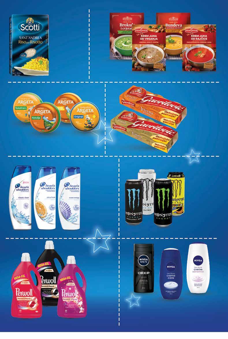 ARGETA Kokošja pašteta razne vrste 95 g 1 kg = 84,11 kn 1 kg = 11,16 € NIVEA Gel za tuširanje razne vrste 250 ml 1 l = 47,96 kn 1 l = 6,36 € PERWOLL Deterdžent za rublje razne vrste 4,05 l 1 l = 12,34 kn 1 l = 1,64 € SCOTTI Riža Sant’Andrea 1 kg MONSTER Energetski napitak razne vrste 0,5 l 1 l = 19,98 kn 1 l = 2,66 € HEAD & SHOULDERS Šampon za kosu razne vrste 360 - 400 ml 1 l = 74,98 - 111,07 kn 1 l = 9,95 - 14,74 € GAVRILOVIĆ Čajna ili jetrena pašteta 3x 100 g 1 kg = 66,63 kn 1 kg = 8,83 € 00,99 4999 kn 6,63 € 00,99 999 kn 1,33 € 00,99 2999 kn 3,98 € odabrani proizvodi -25% PODRAVKA Krem juhe SUPER PONUDA! 2599 kn 3,45 € -33% 38,99 kn 5,17 € SUPER PONUDA! 799 kn 1,06 € -15% 9,49 kn 1,26 € SUPER PONUDA! 1999 kn 2,65 € -21% 25,49 kn 3,38 € SUPER PONUDA! 1199 kn 1,59 € -50% 23,99 kn 3,18 € Fotografije proizvoda ne moraju u potpunosti odgovarati stvarnom izgledu proizvoda. Kupnja je moguća samo u količinama primjerenim za kućanstvo. Sve navedene cijene izražene su u kunama i eurima s PDV-om. Fiksni tečaj konverzije €/kn: 7,53450. Ne odgovaramo za tiskarske pogreške. 11